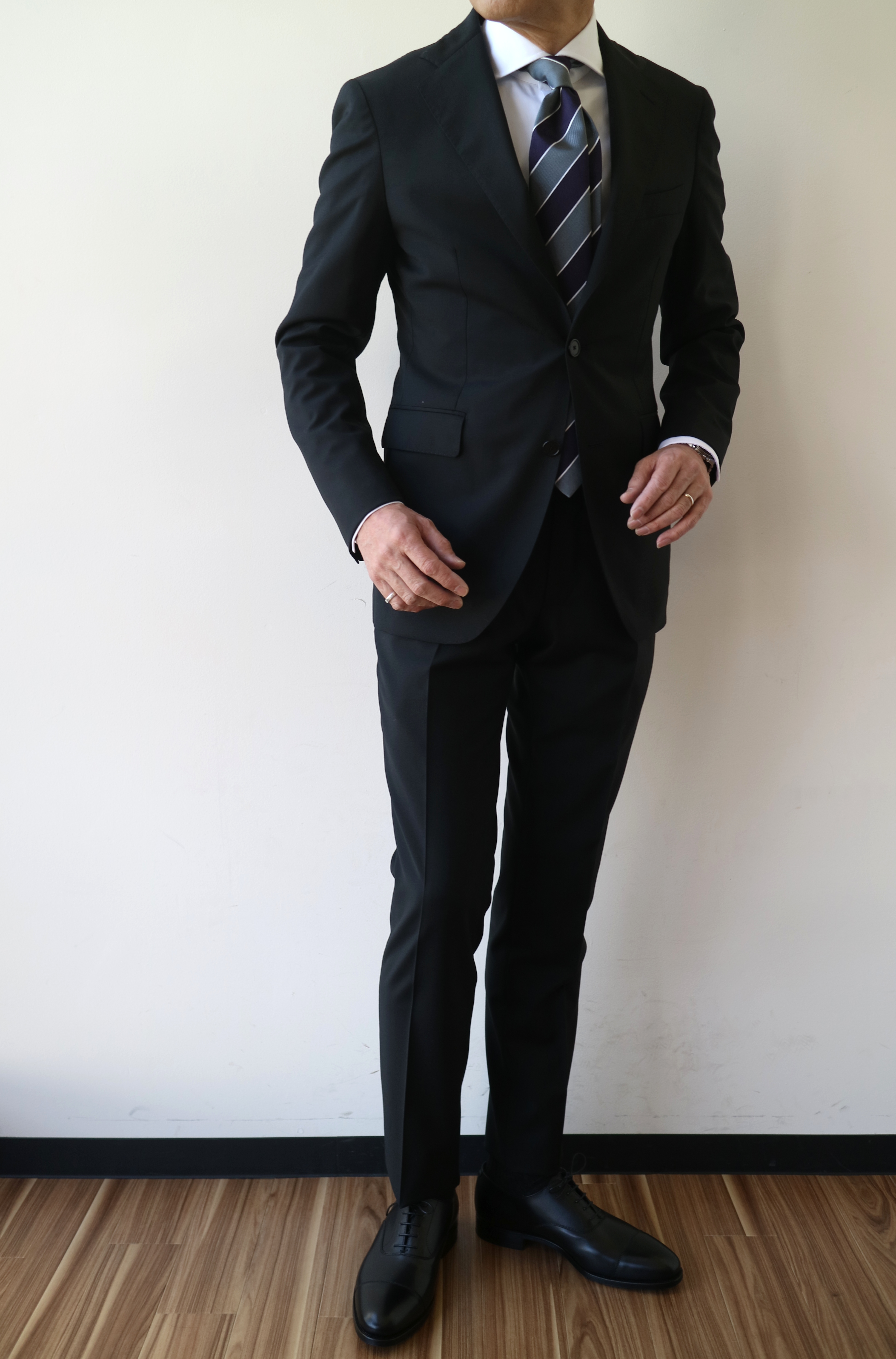今回、オケージョン用としてセレクトしたのは、SUPER110'Sのネイビーとブラックです。オトコのワードローブには欠かせない2着です。