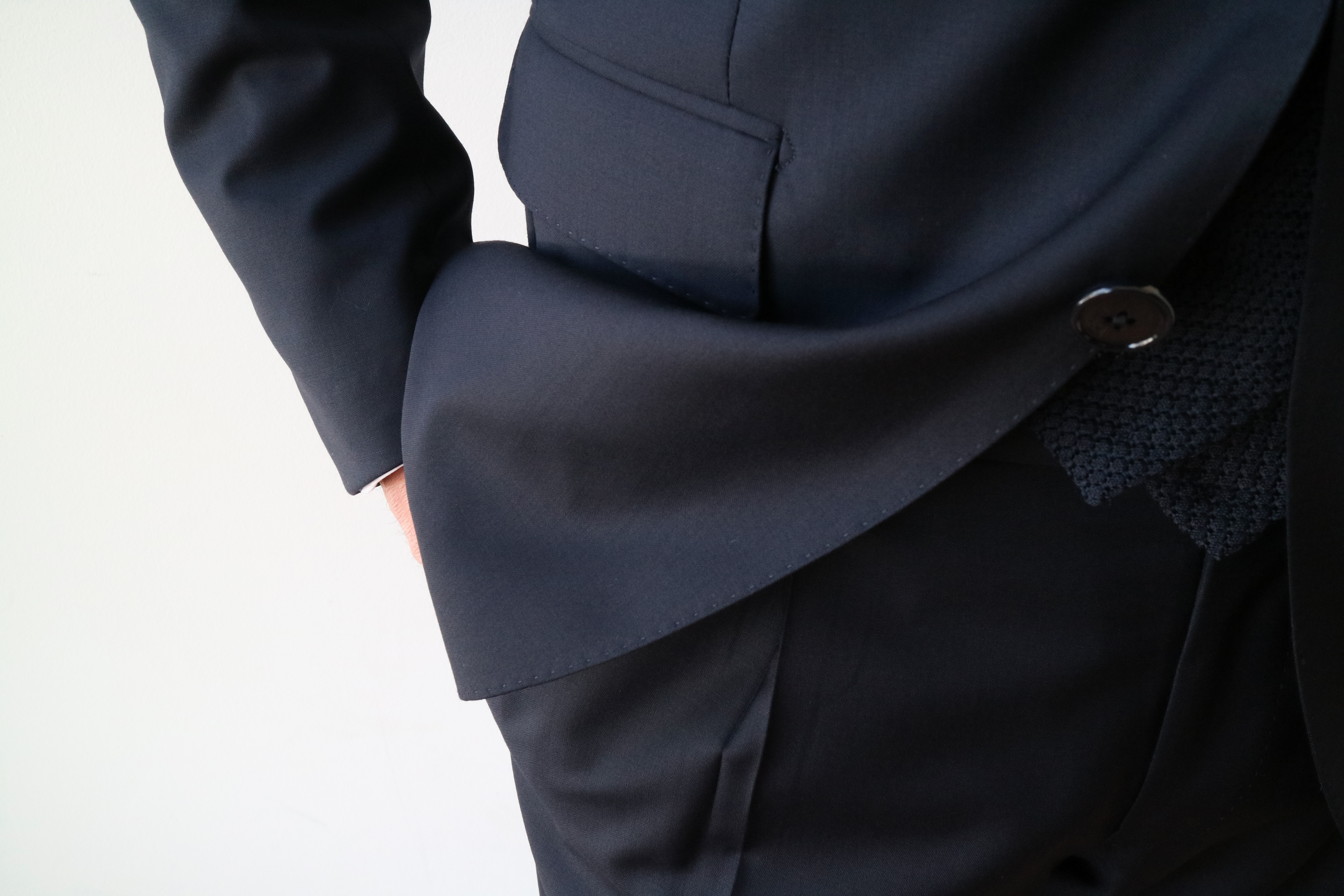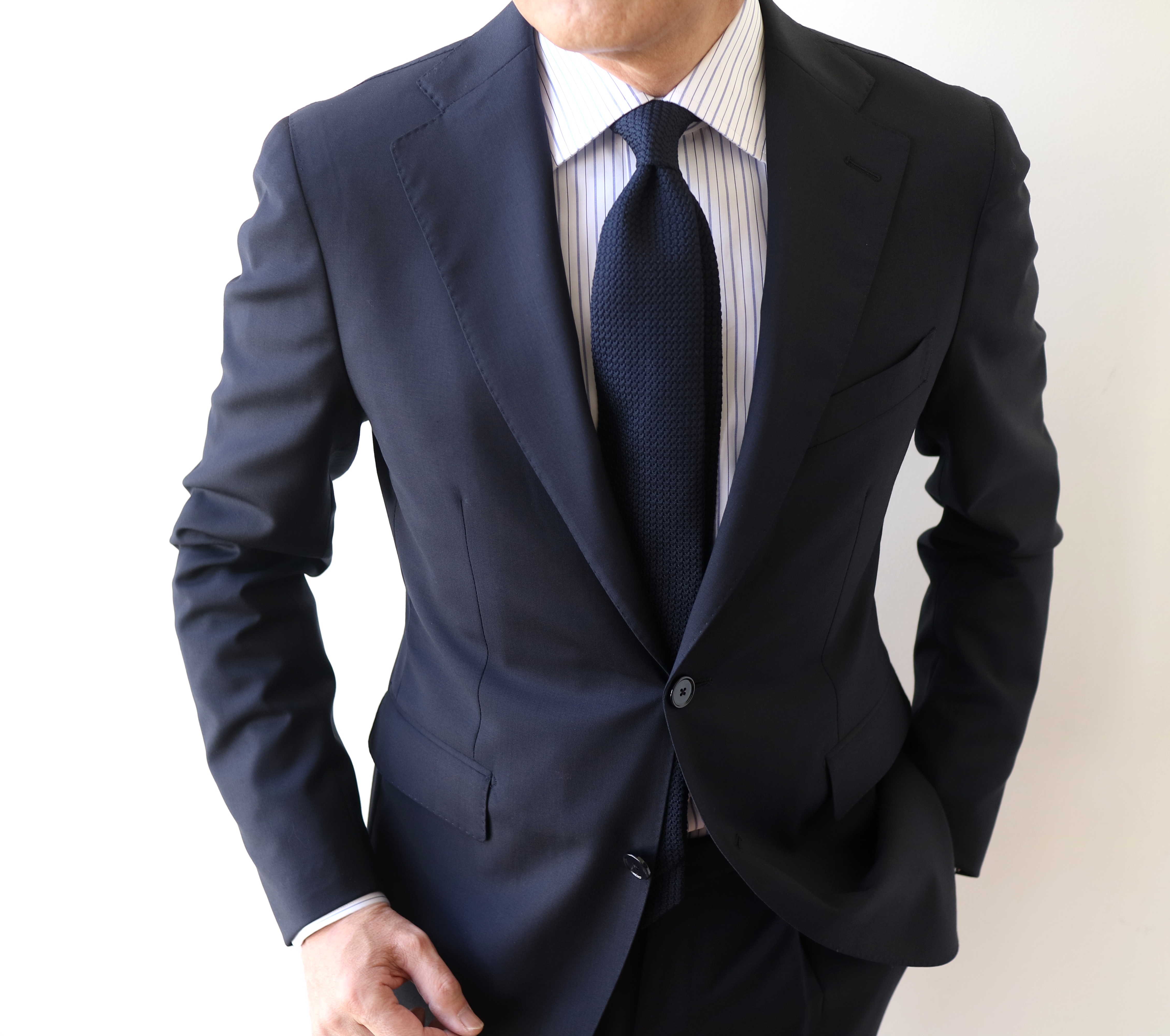 ウールベースにコットン、少々のナイロンとストレッチ素材が混ざったホップサックのネイビースーツ。光に向かって翳すと、向こう側が透けて見えるほどのザックリとした、清涼感溢れるスーツです。夏は暑いから...なんて、もう言わせない、そんな言い訳のいらない夏仕様に仕上がっております。