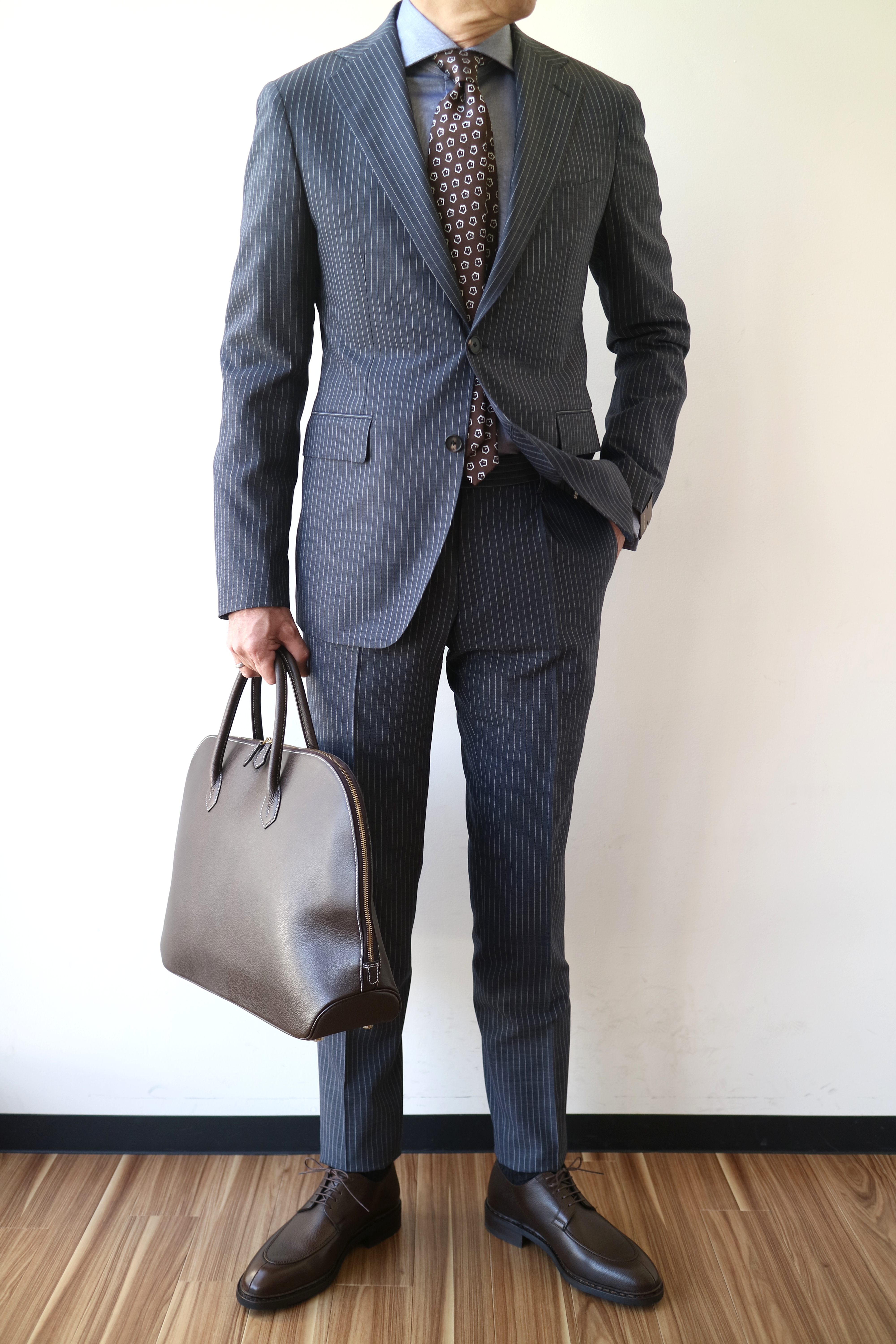 合わせたシャツは未公開のBAGUTTA(バグッタ)、ネクタイは未公開のHolliday&Brown(ホリデー&ブラウン)、靴はParaboot(パラブーツ)、手に持ったバッグはCISEI(シセイ)です。