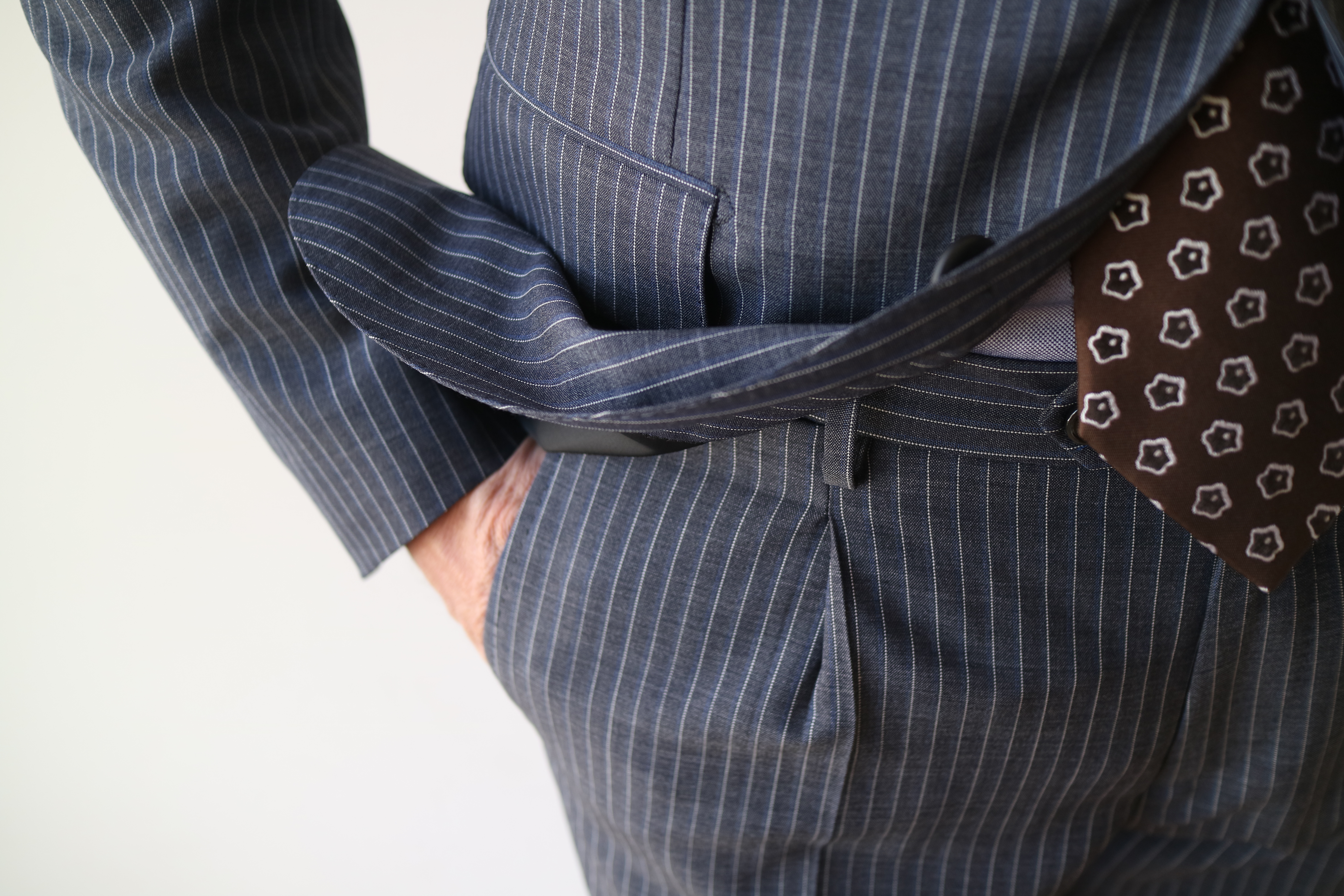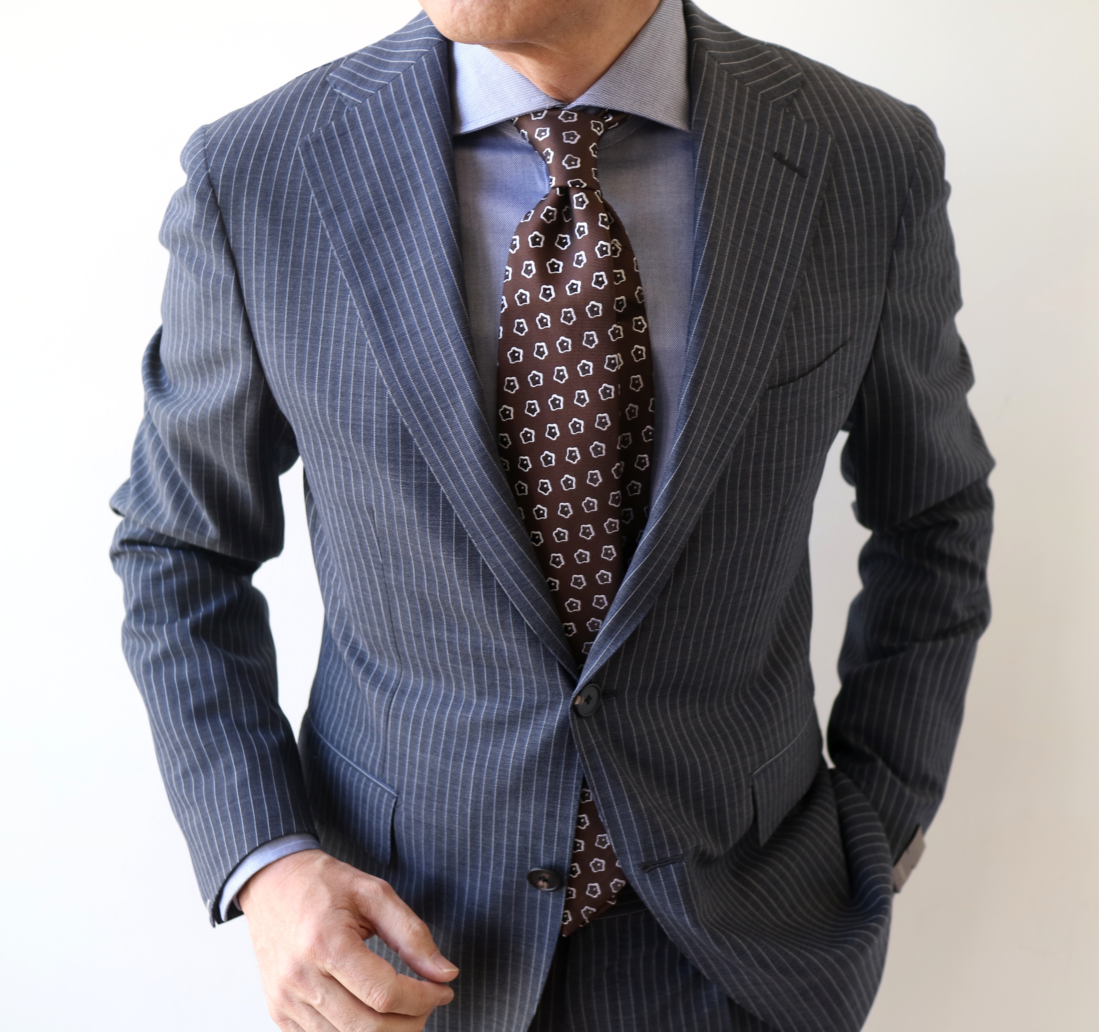 素材は、SUPER130'Sのしなやかなウール。派手すぎず地味すぎず、控えめでありながら存在感のあるストライプ柄のスーツです。グレイには茶系のネクタイであわせるのが、今の気分でしょうか。