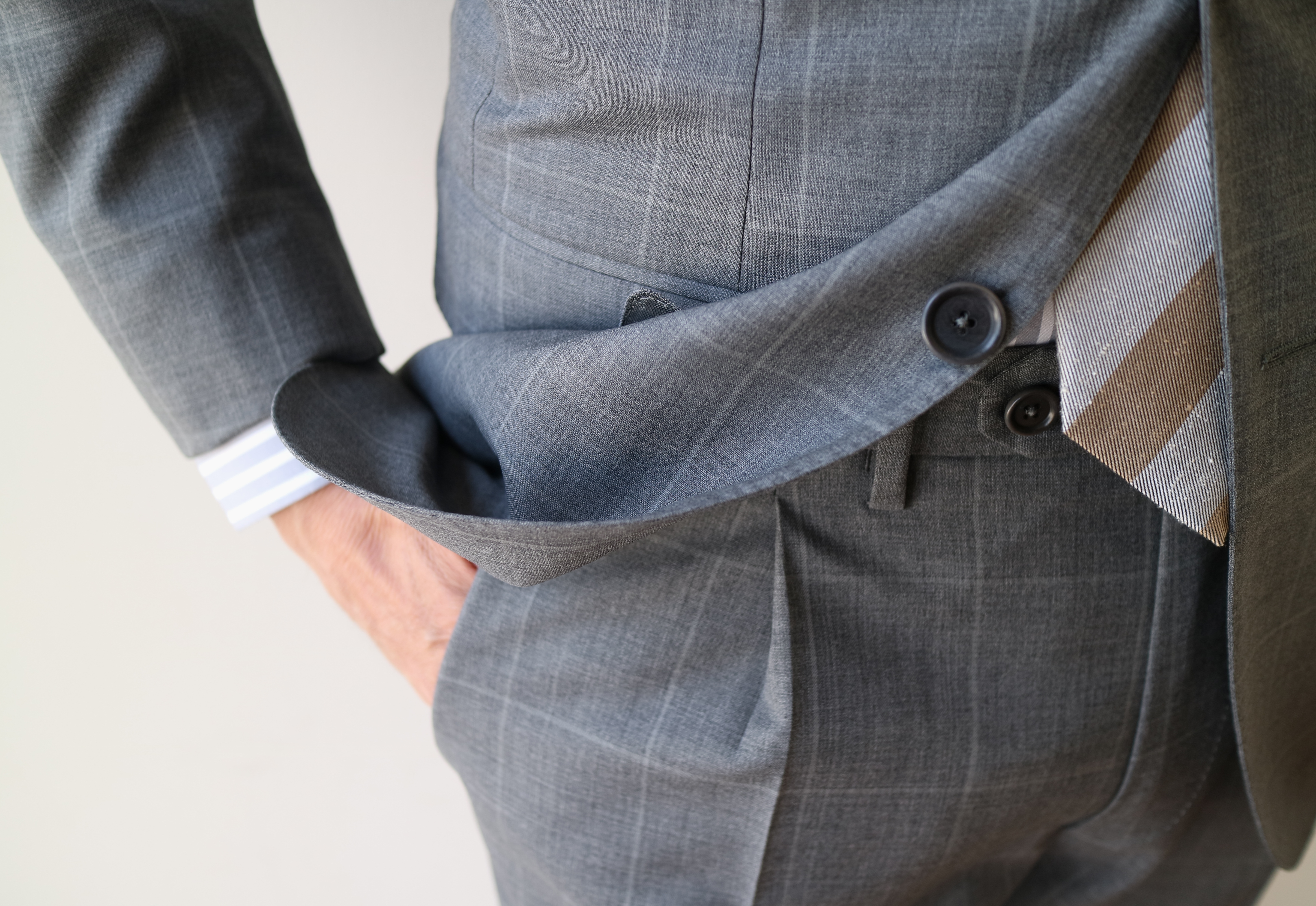ライトグレイ、ウィンドウペンの2つのキーワードで探していたら、いい生地が見つかりました。無地だけでは平面過ぎる、かといって強いペン柄は好きではない...なんて、かなり個人的な好みでのバイニングはいつものことですが、【De Petrillo/デ ペトリロ】の生地コレクションは、そんな嗜好に沿うものが多くあります。SUPER120'Sの上品なライトグレイのウィンドウペン柄。涼やかな春夏のスーツとしてワードローブに加えてみてください。