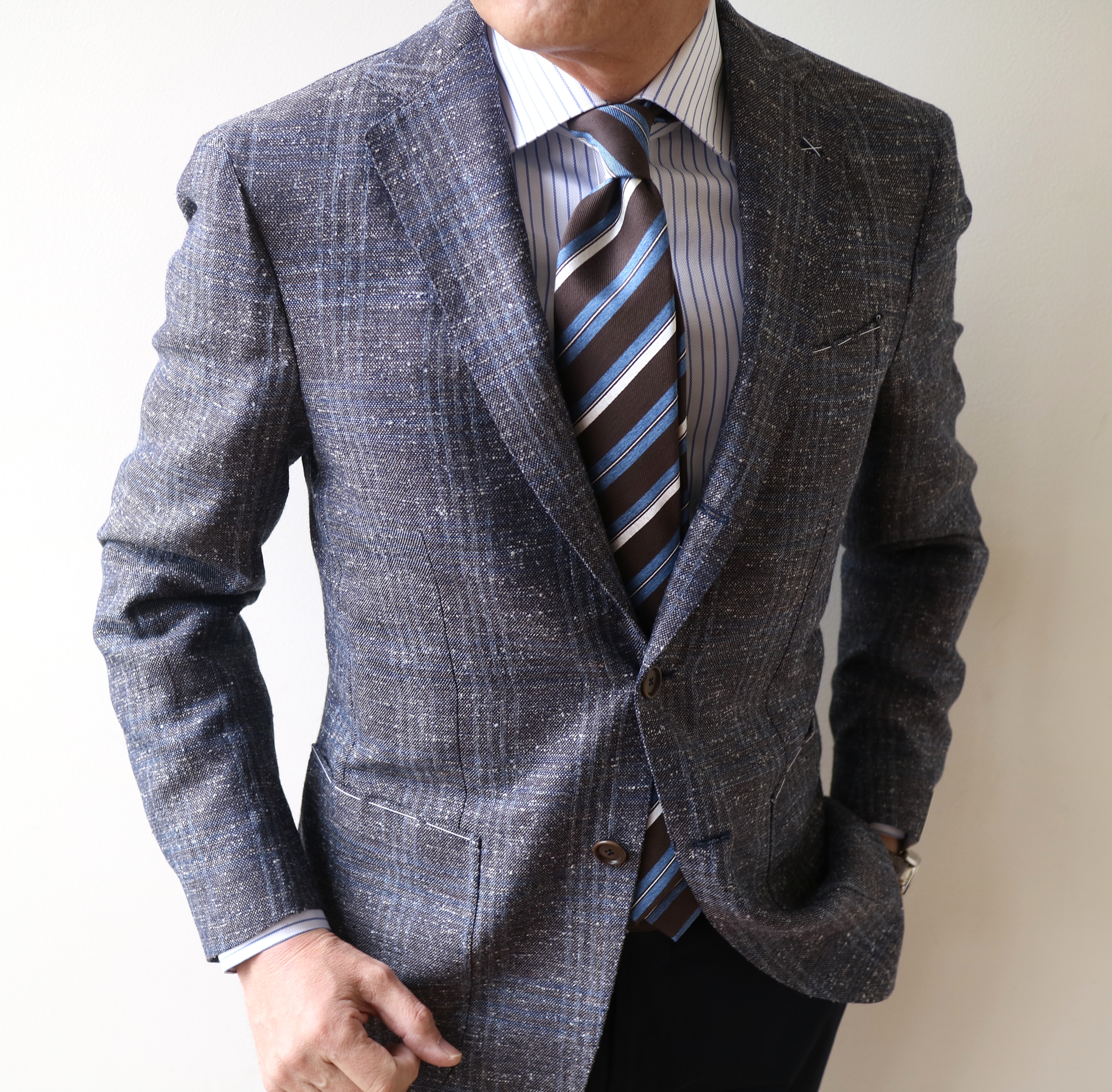 こちらのコーディネートも参考にしてください。合わせたネクタイは、どちらも近日中にご案内させていただきます。