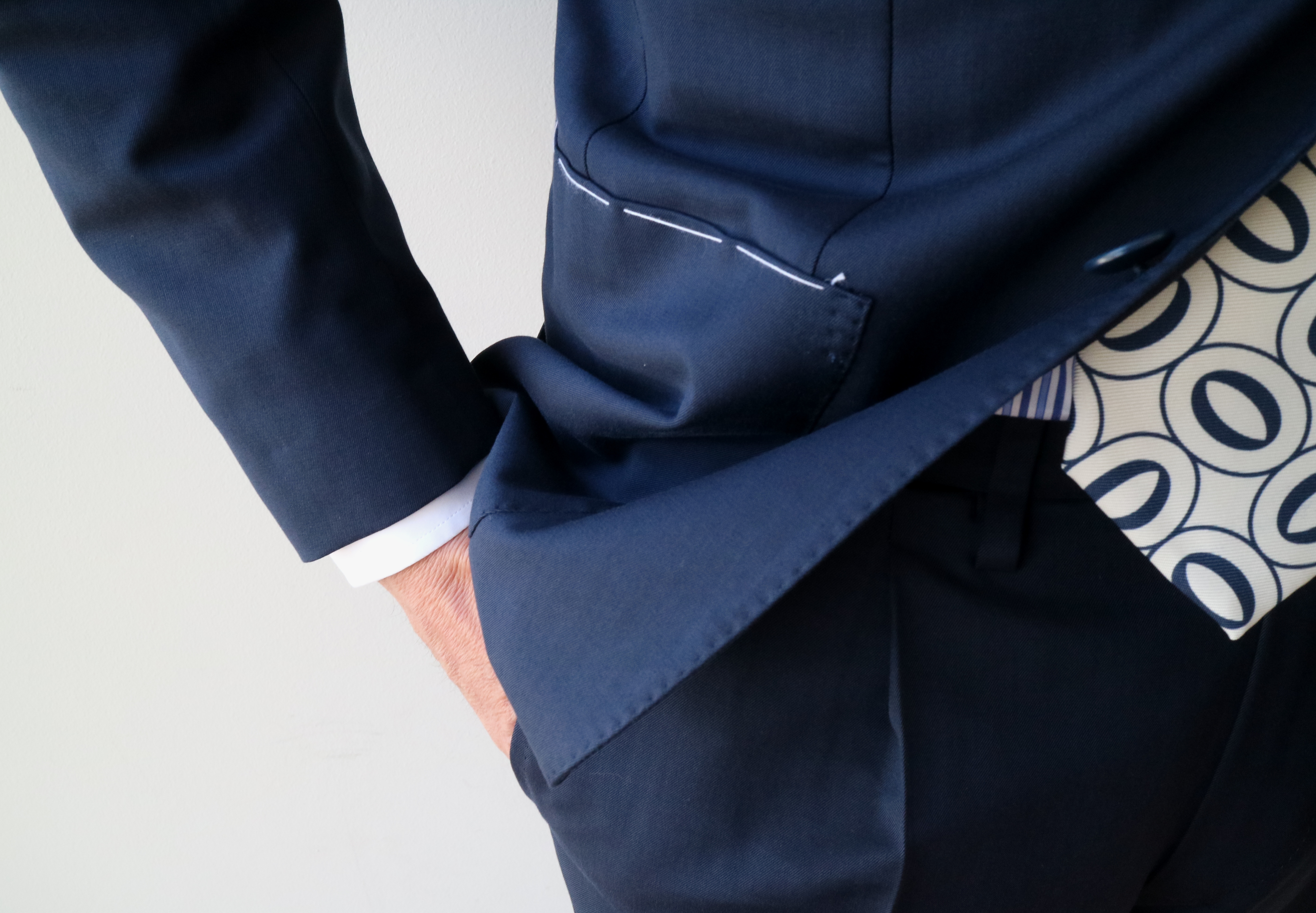「SUPER120'Sトロピカルウール無地スーツ」でネイビーを選んでおりますが、コットンが入るとぐっとラフな印象に変わります。選んだモデルは、ハーフキャンバス仕立て「NAPOLI」で、肩の仕立てを軽くした3つ釦、2パッチポケット仕様の「Posillipo」です。単品ジャケットとしても着用可能な万能モデルです。