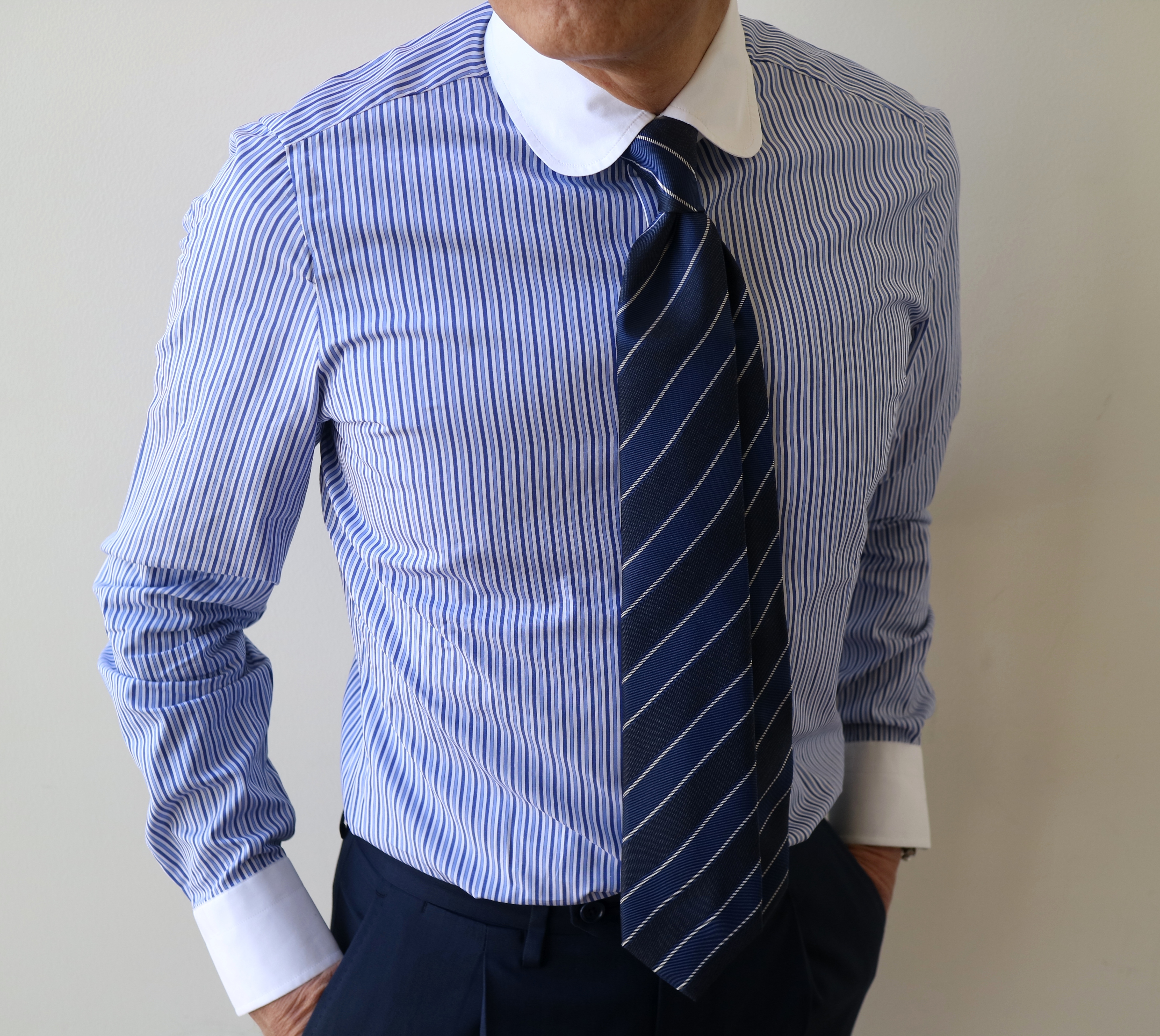 合わせたシャツはFinamore、ネクタイはFRANCO BASSI、パンツはPT01、ベルトはWilliam、靴はCROCKET&JONESです。