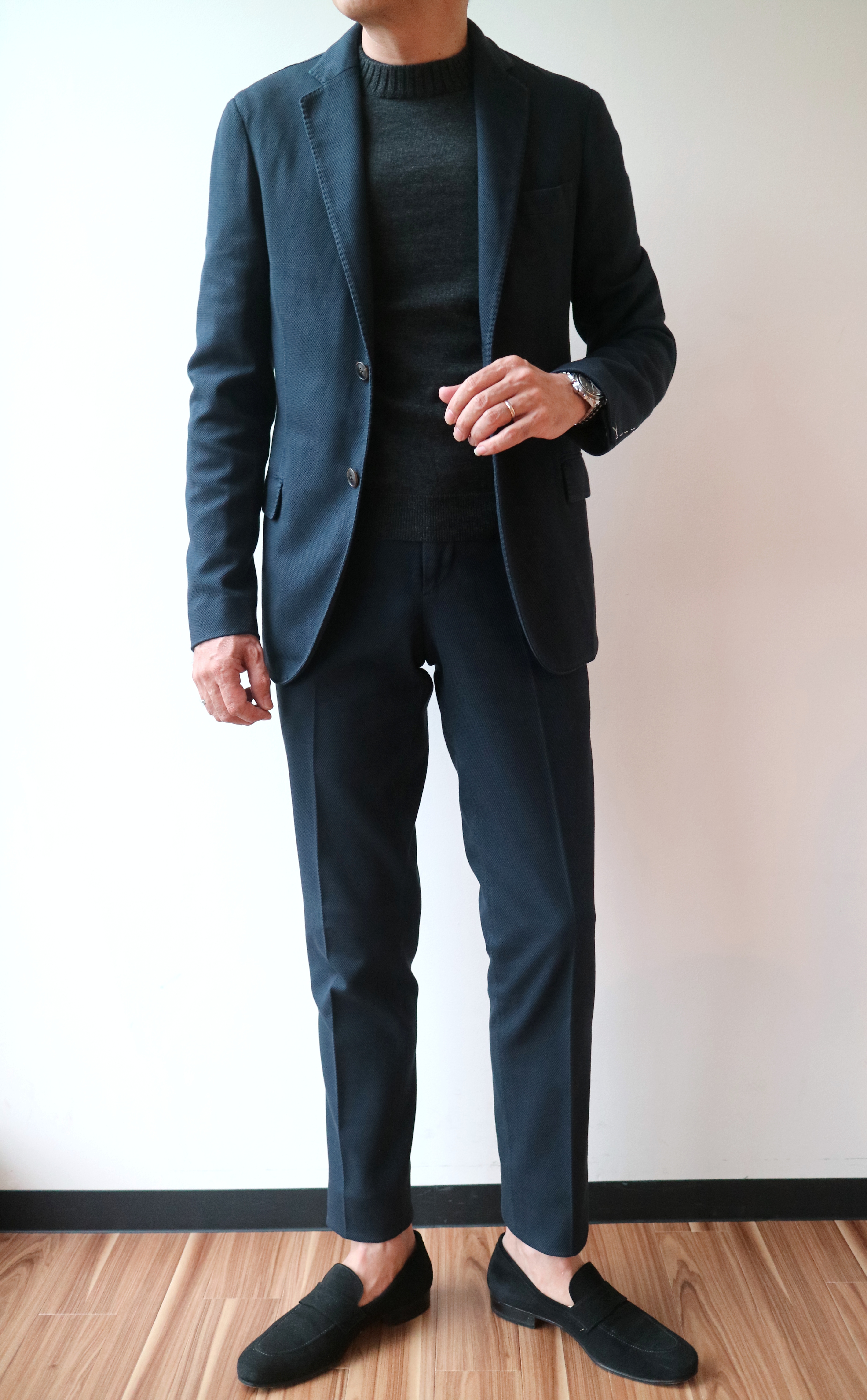 モデルは身長175cm、体重63K、胸囲91㎝で、サイズ44をややタイトに着用しております。合わせたニットはCruciani、靴は私物のFERRANTEです。