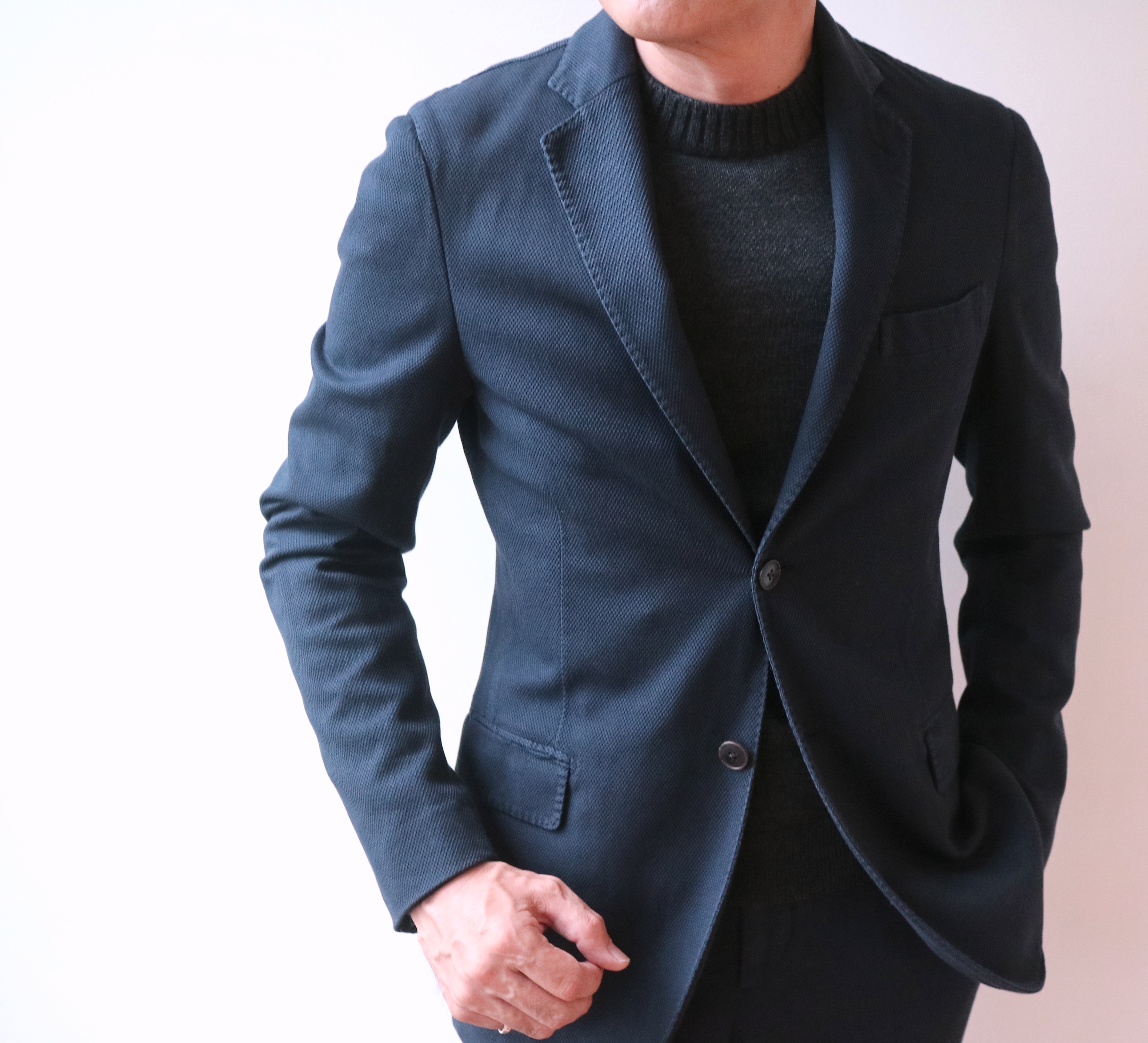 昨日に続いての【BOGLIOLI MILANO/ボリオリ ミラノ】です。画像が黄ばんでしまっておりますが、実際はまさにネイビーです。モデル名は「CASATI/カザティ」のスーツ。製品染め&製品洗い、いわゆるガーメントダイ加工の「K.Jaket」からのエボリューションで、短丈のラペル幅の狭いモダンでスポーティーなモデルです。