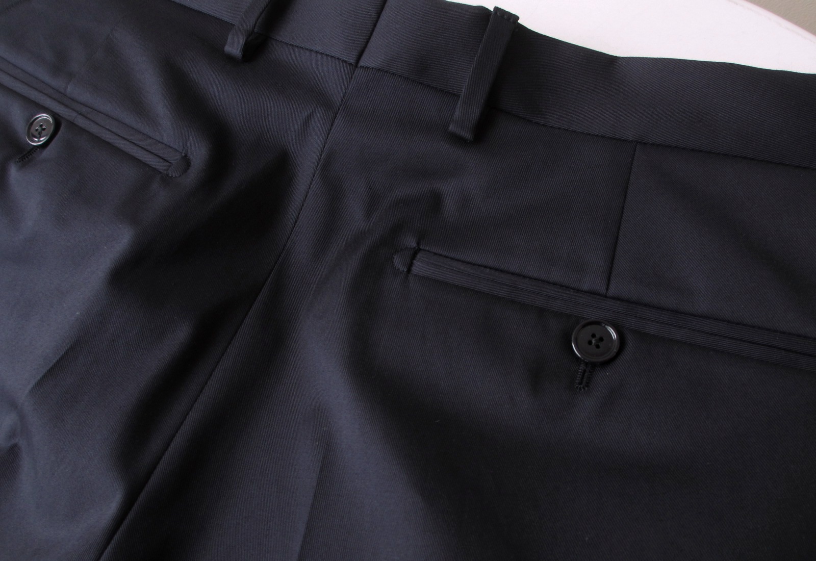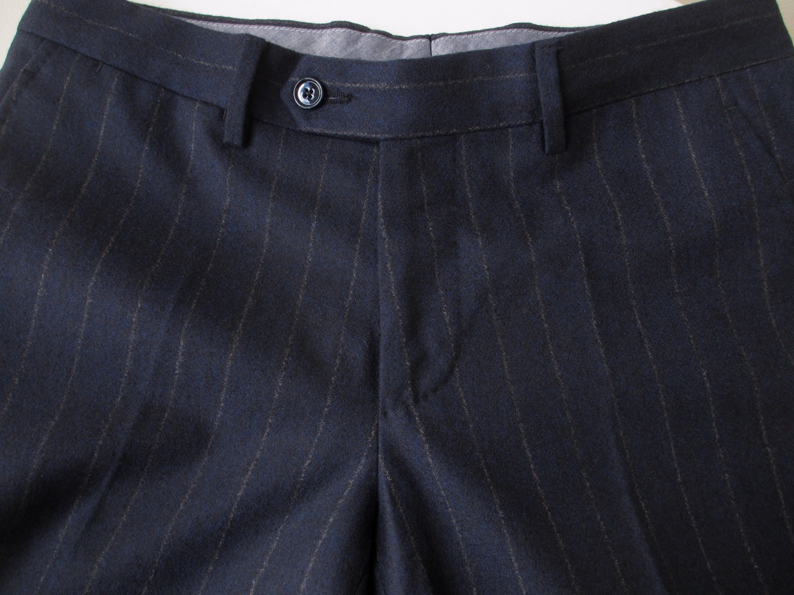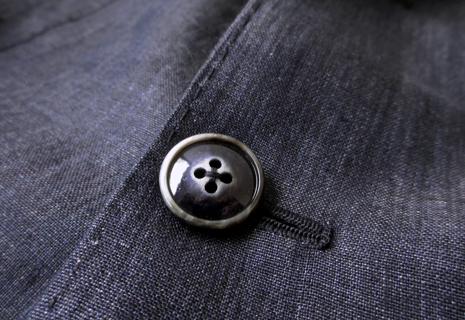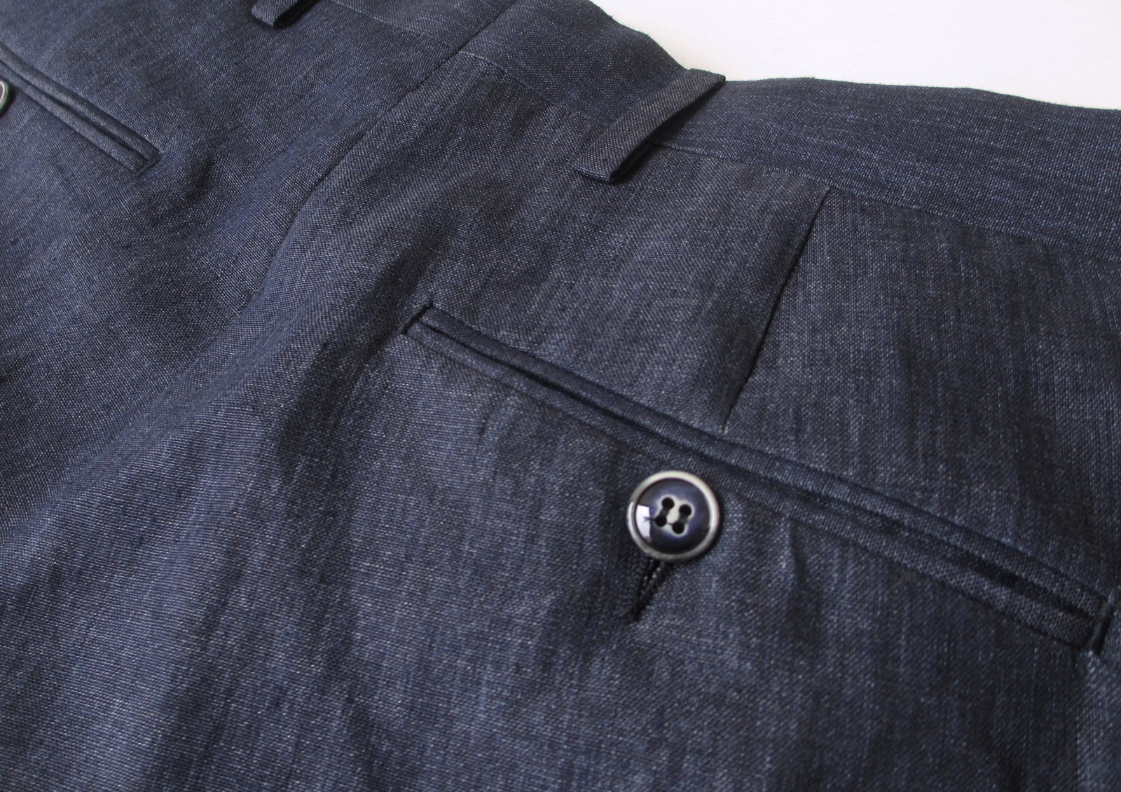 ネイビーというより、この掠れ感はインディゴですね。ジャケット両サイドのポケットはパッチではなく、フラップなしの両玉縁で。地に合わせた青の釦も素敵です。