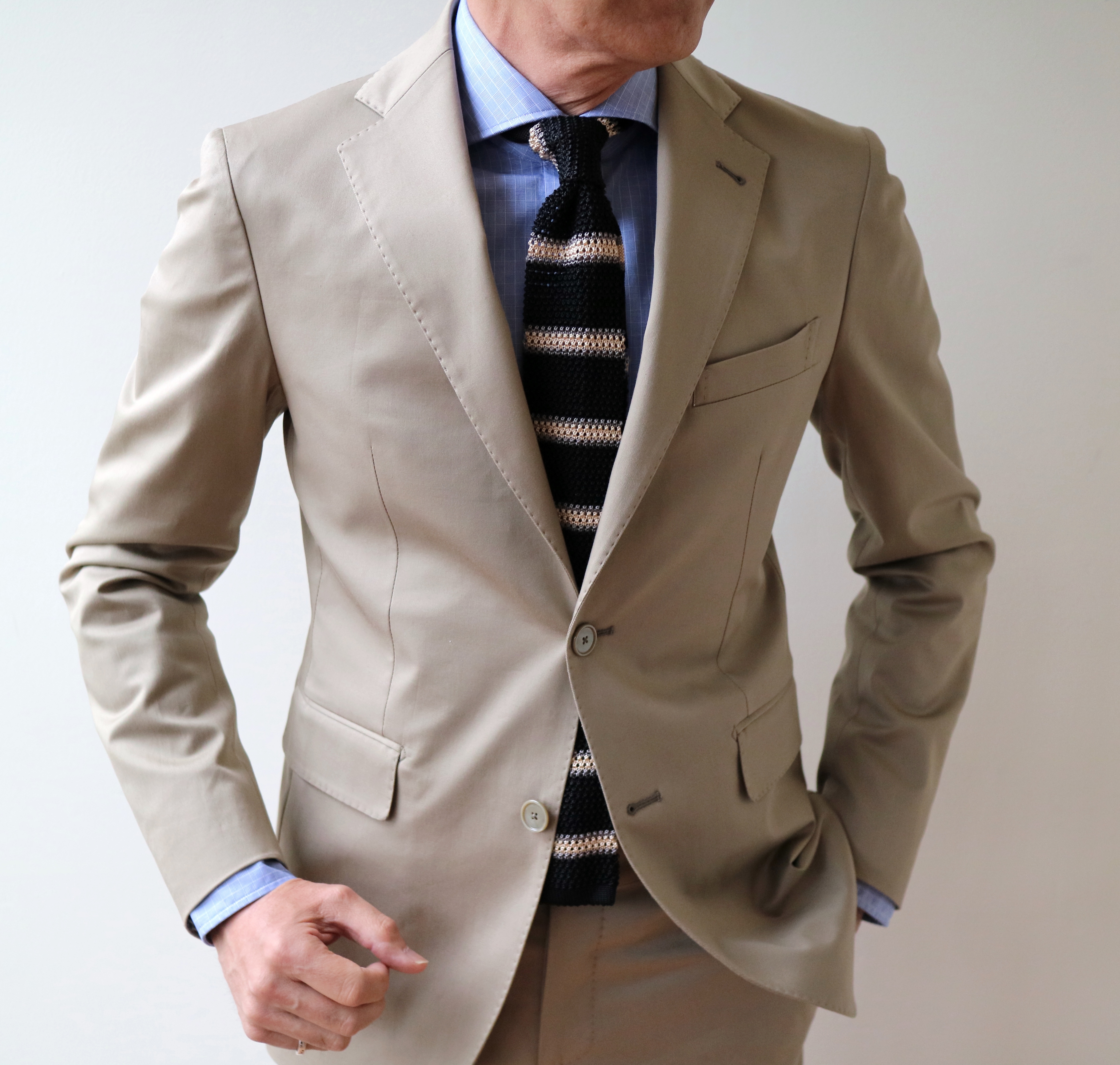 ウールのしなやかさ、リネンのドライなシャリ感、シルクの滑らかで上品な光沢。いいとこ取りの3者混紡素材です。ウール100%と比べ、明らかに表情豊かな夏仕様のスーツです。