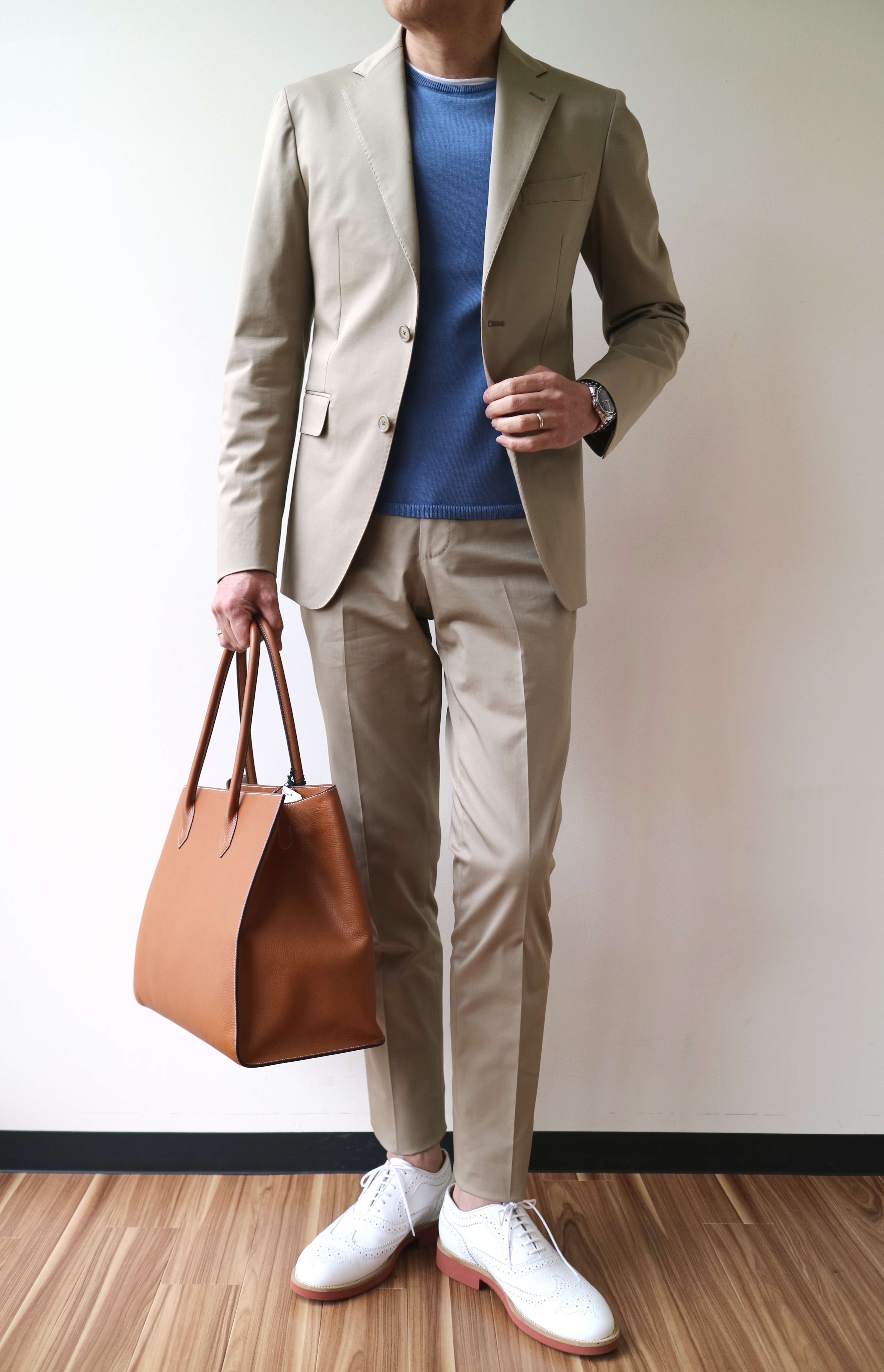 ベージュで合わせたシャツはBARBA、ネクタイはAD56、バッグはCISEI、靴はParaboot。ネイビーのシャツもBARBA、ネクタイはLUIGE BORRELLI、靴はParabootです。