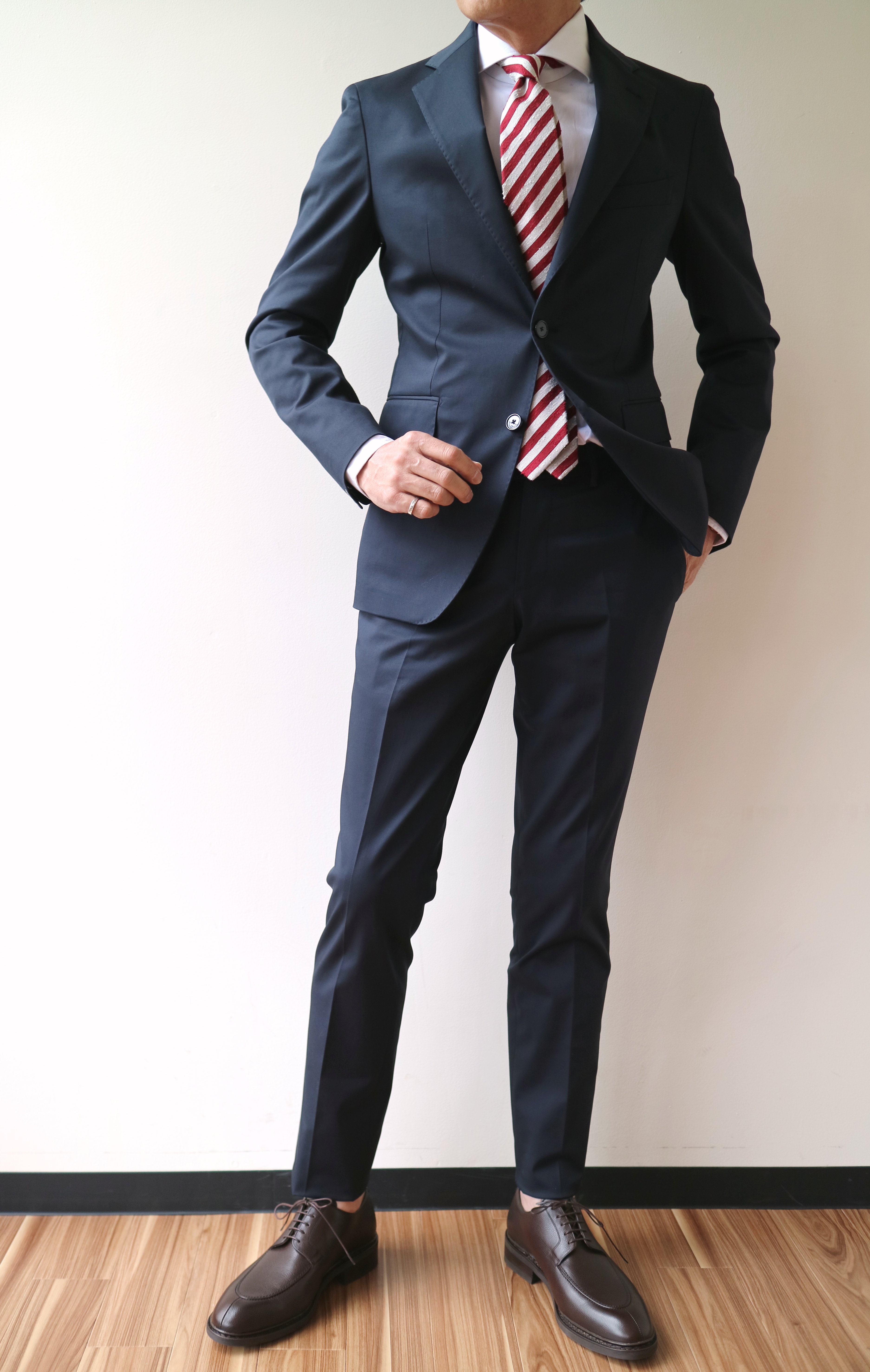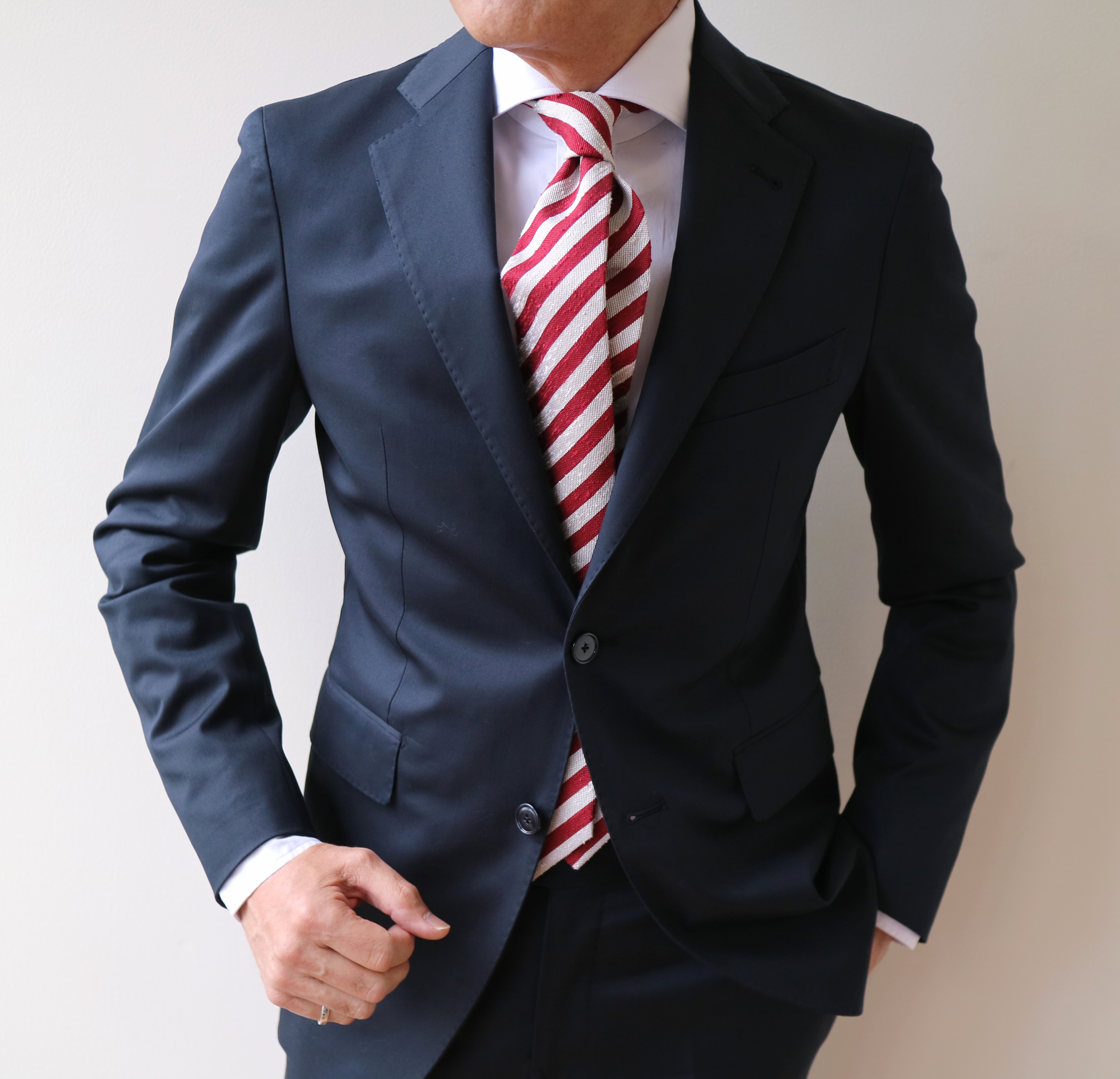 オーセンティックに見えるネイビーのバンカースーツですが、只者ではありません。気温上昇と共にオトコを上げるなら、このスーツはお勧めです。