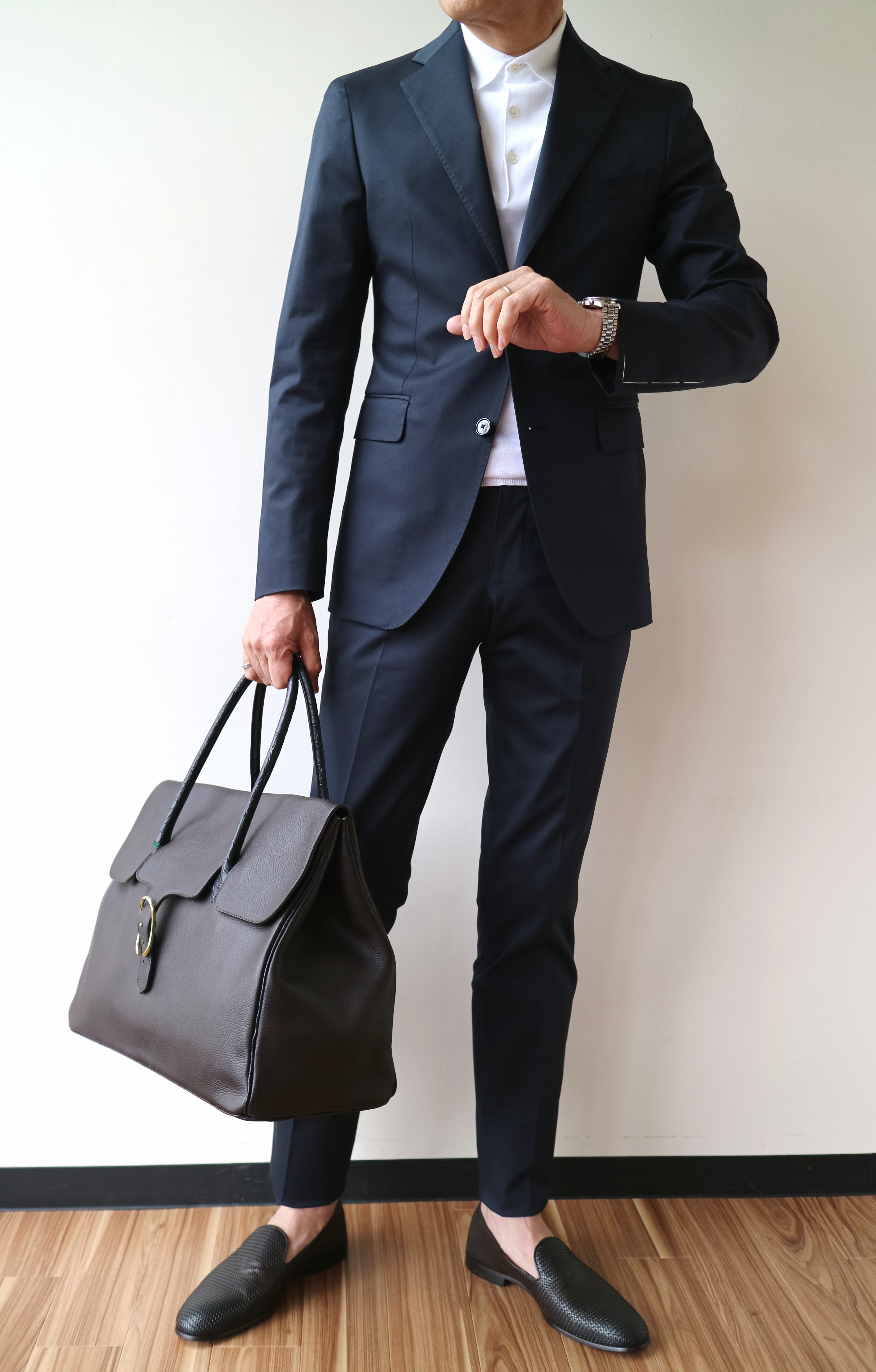 合わせたシャツは共にMario Muscariello、ネクタイはブラックがAD56、ダークブルーはHolliday&Brown、ベルトはWhite House Cox、靴はCROCKETT&JONES、バッグはCISEIです。