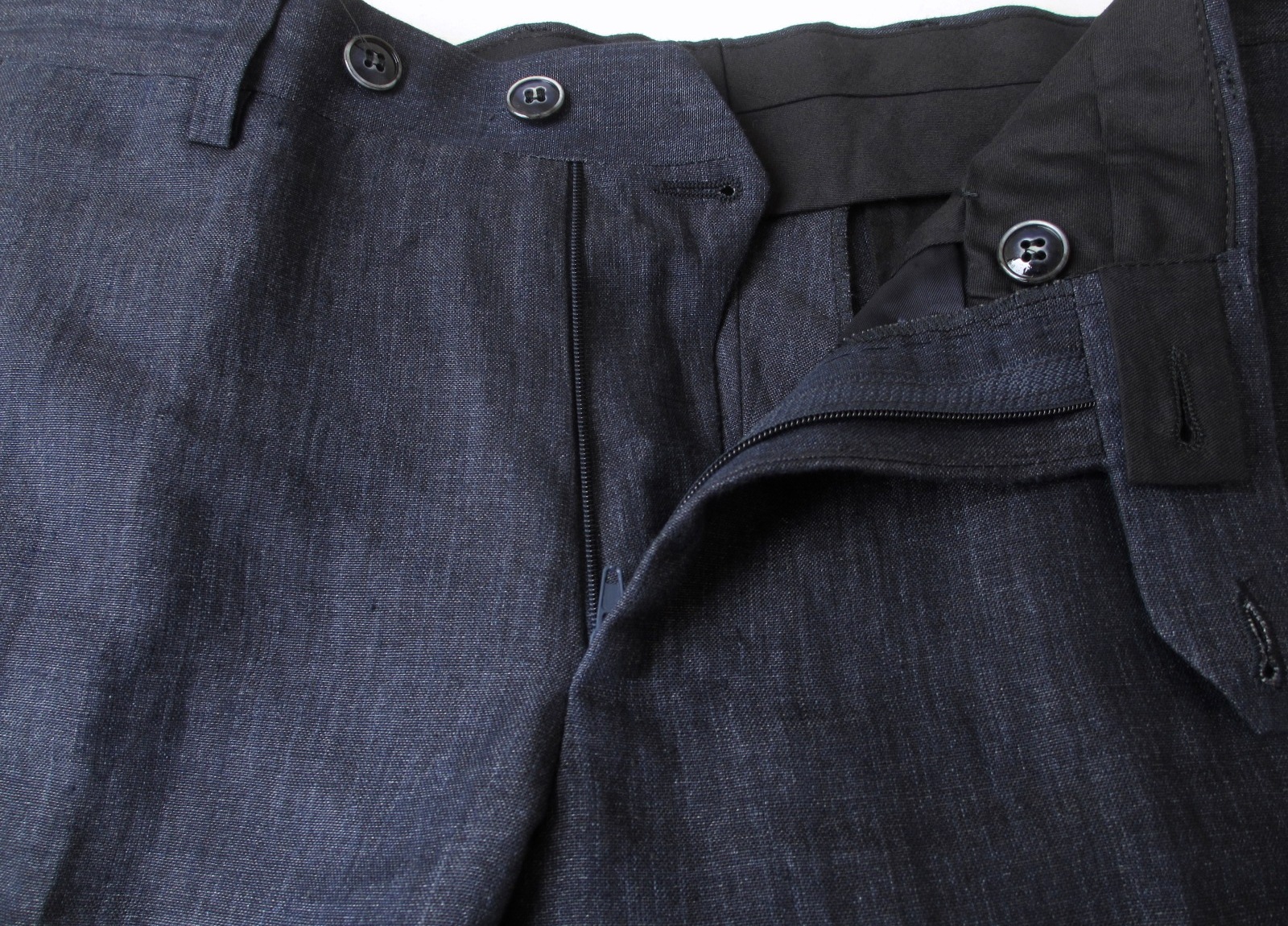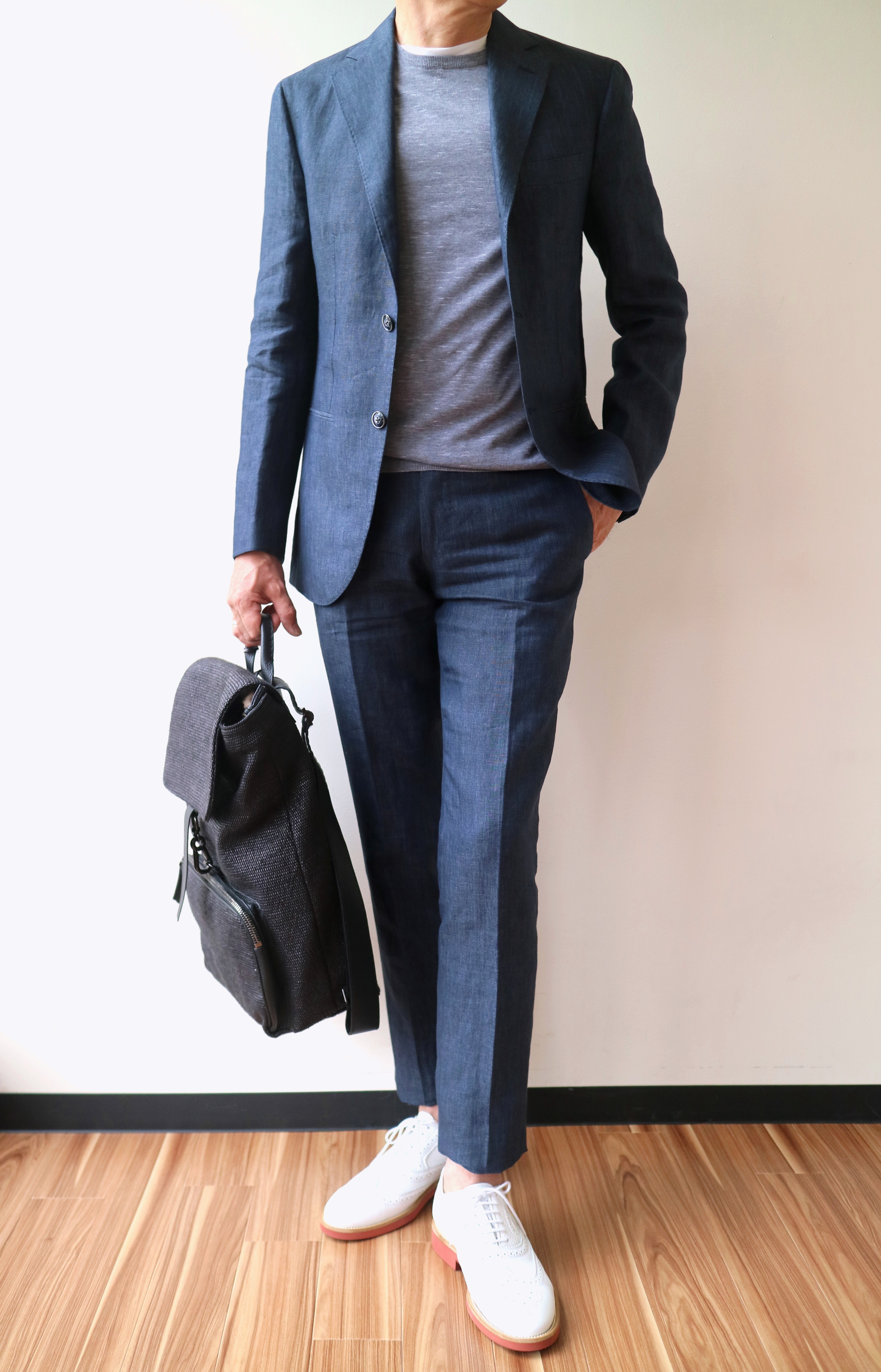 思わず、カメラマンのジュニアに「ピン、とって」と言ってしまったほど魅力的なリネンのスーツ。いや、お客様優先です。先にご紹介させていただいたブラウンと同じ生地。ネイビーのみスーツ仕様にしてみました。