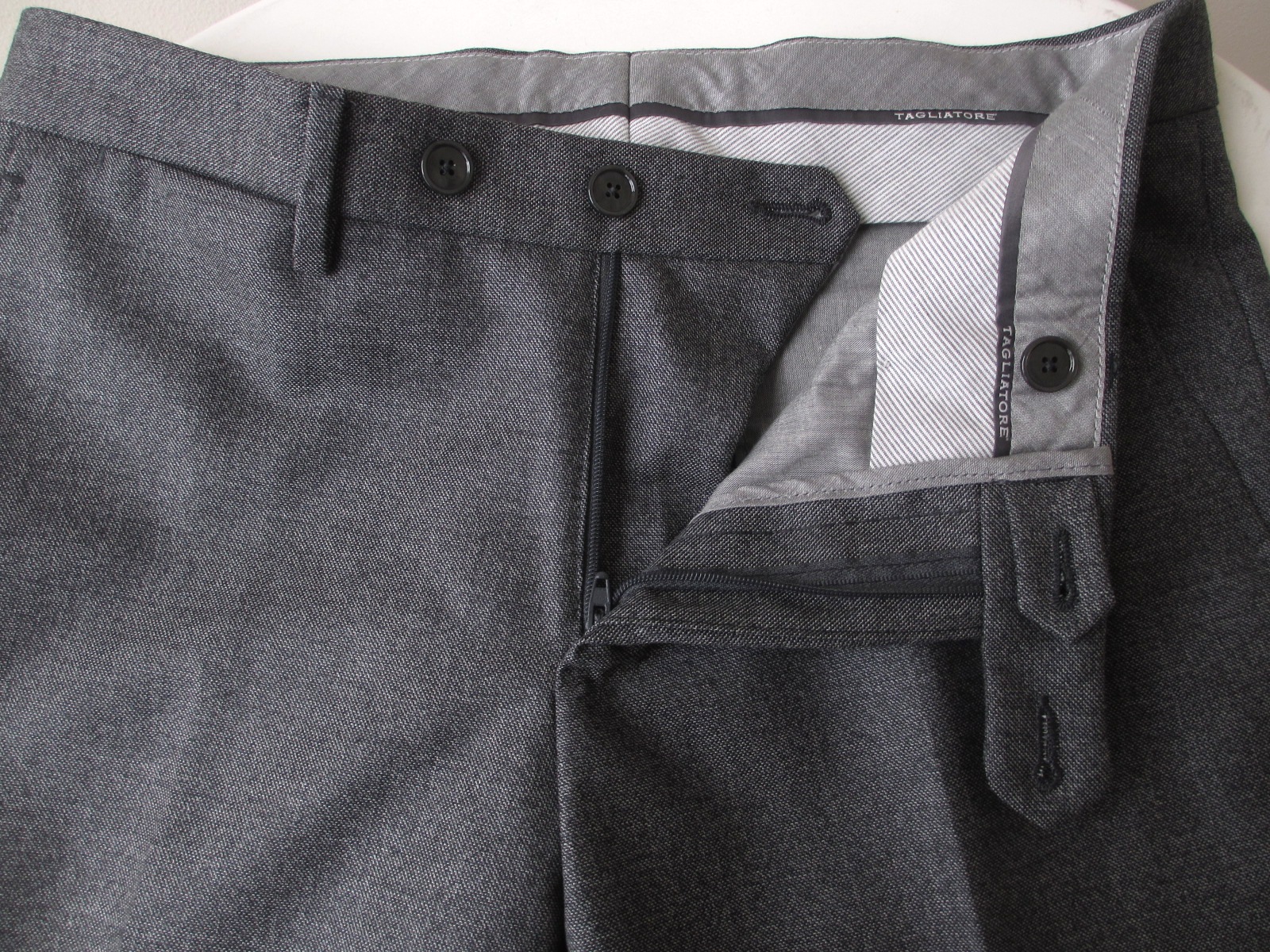 【TAGLIATORE/タリアトーレ】の「VESVIO」スーツです。ジャケットのイメージが強いと思われがちですが、私どもグローリーガイではスーツファンの多いブランドとして定着しています。ウエストの高い位置からの絞込みが男らしい上半身を作りだし、絞り位置が高い分、ウエストから裾にかけての流れるようなラインは、なんとも美しくエレガントです。ボトムもジャケットの蹴回しに合わせて、少しゆとりを取りながら裾にかけてのテーパードライン。細身のパンツを好む方にとっては堪らなく魅力的です。ボディコンシャルなスタイルが窮屈かと言えば、そうでもありません。曲線の持つマジックと言えば大袈裟かもしれませんが、決して窮屈感がないのです。そこが、オーナーでありデザイナーでもあるピーノ氏の天才といわれる所以なんでしょう。