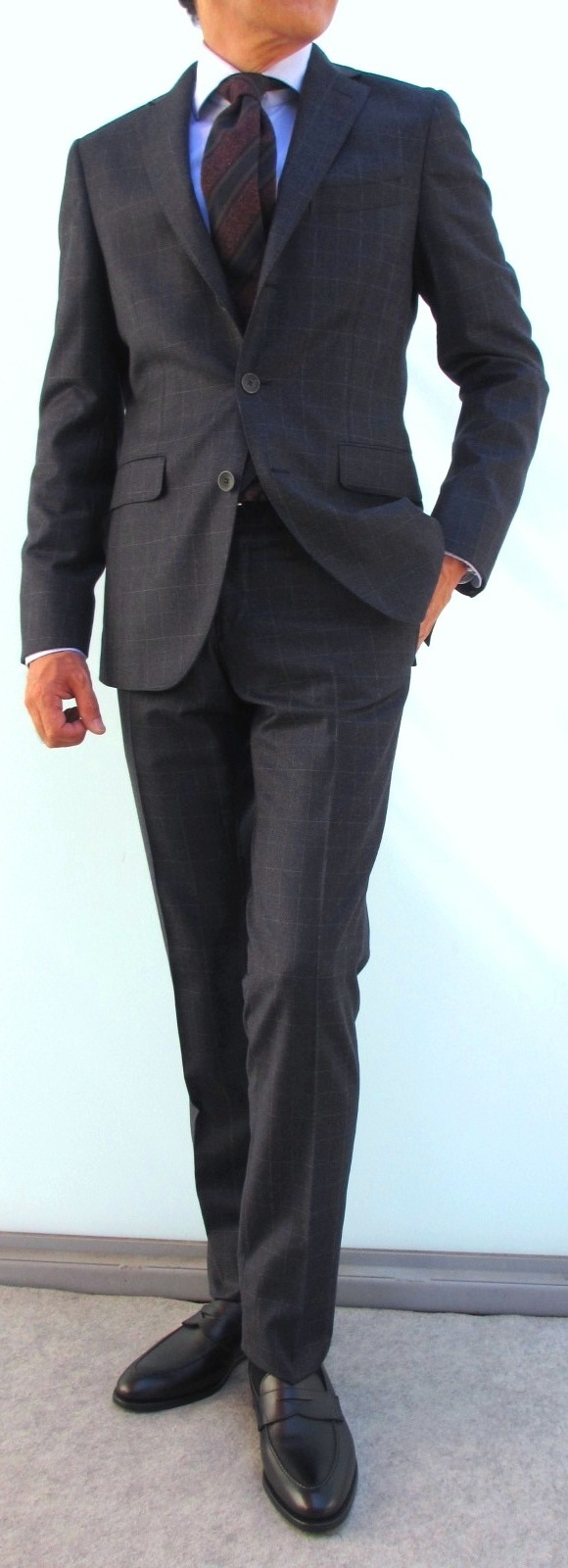 昨年、12月30日にご紹介させていただいた【TAGLIATORE/タリアトーレ】のスーツを着てみました。正月休みの3日日間、どこにも出かけず、駅伝を見ながらの食っちゃ寝状態。それだけに、サイズが気になりましたが、いつものように、ややタイトですが、44を着用することができました。ブルー系のスーツ3型をご覧ください。ショッピングサイト「SUGURU SHOP」には、1月8日(木)に掲載予定です。