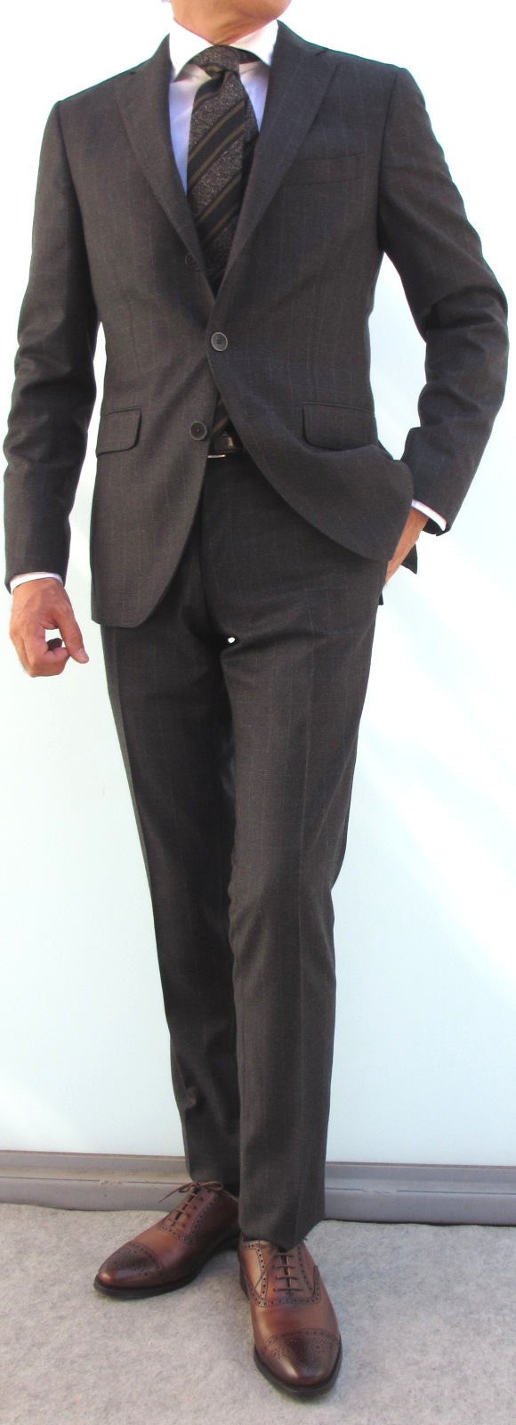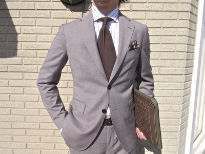 グレイやネイビー系の提案が多いスーツの中で、ブラウンは新鮮です。グレイやネイビーに比べると、柔らかみのある印象に見えるブラウンは、外しや崩しのコーディネートをしてみるのも良いですね。金曜日のローテーションは、コレに決まりでしょうか。