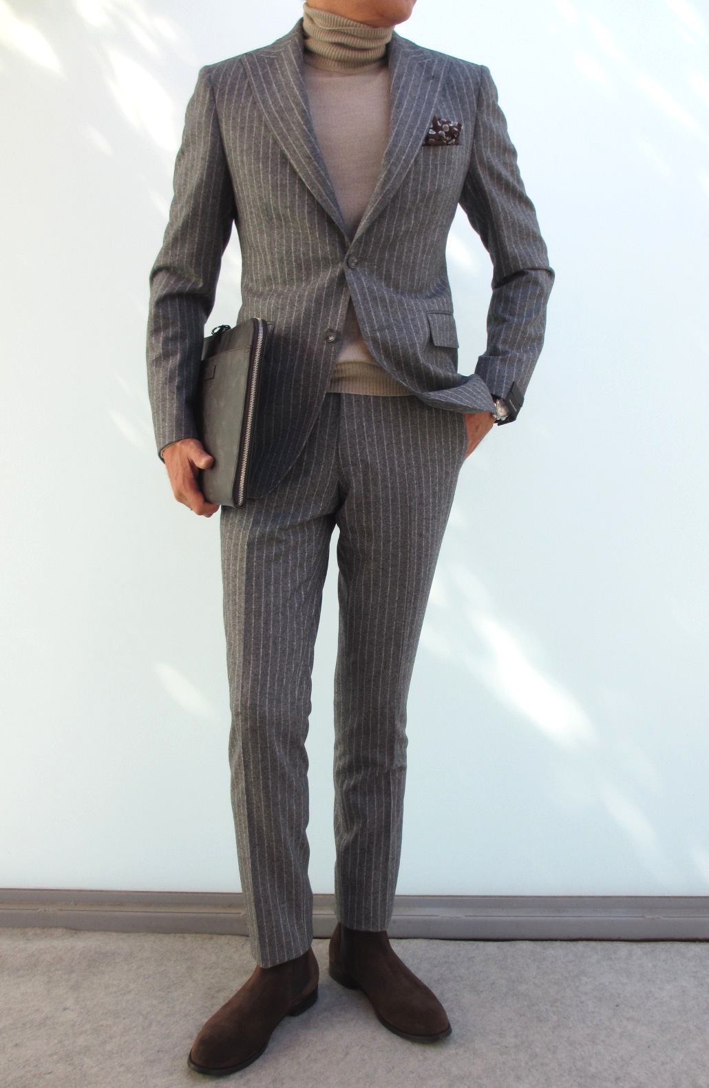 モデルは身長175㎝、体重63㎏、胸囲91㎝でサイズ44を着ております。合わせたスーツはTAGLIATORE(未公開)、ニットはJOHN SMEDLEY、手に持ったバッグはZANELATO、靴は DOUCAL'Sです。