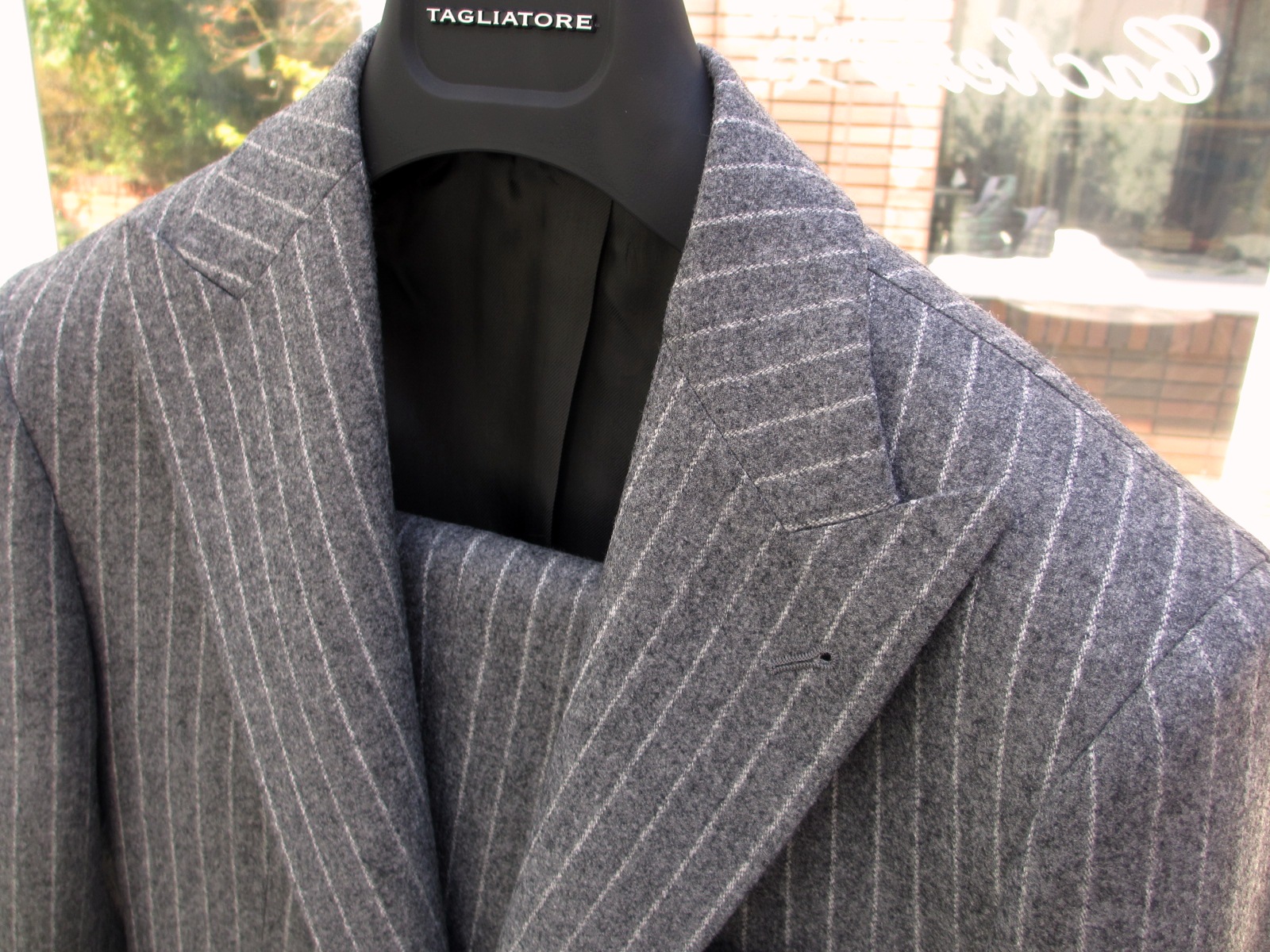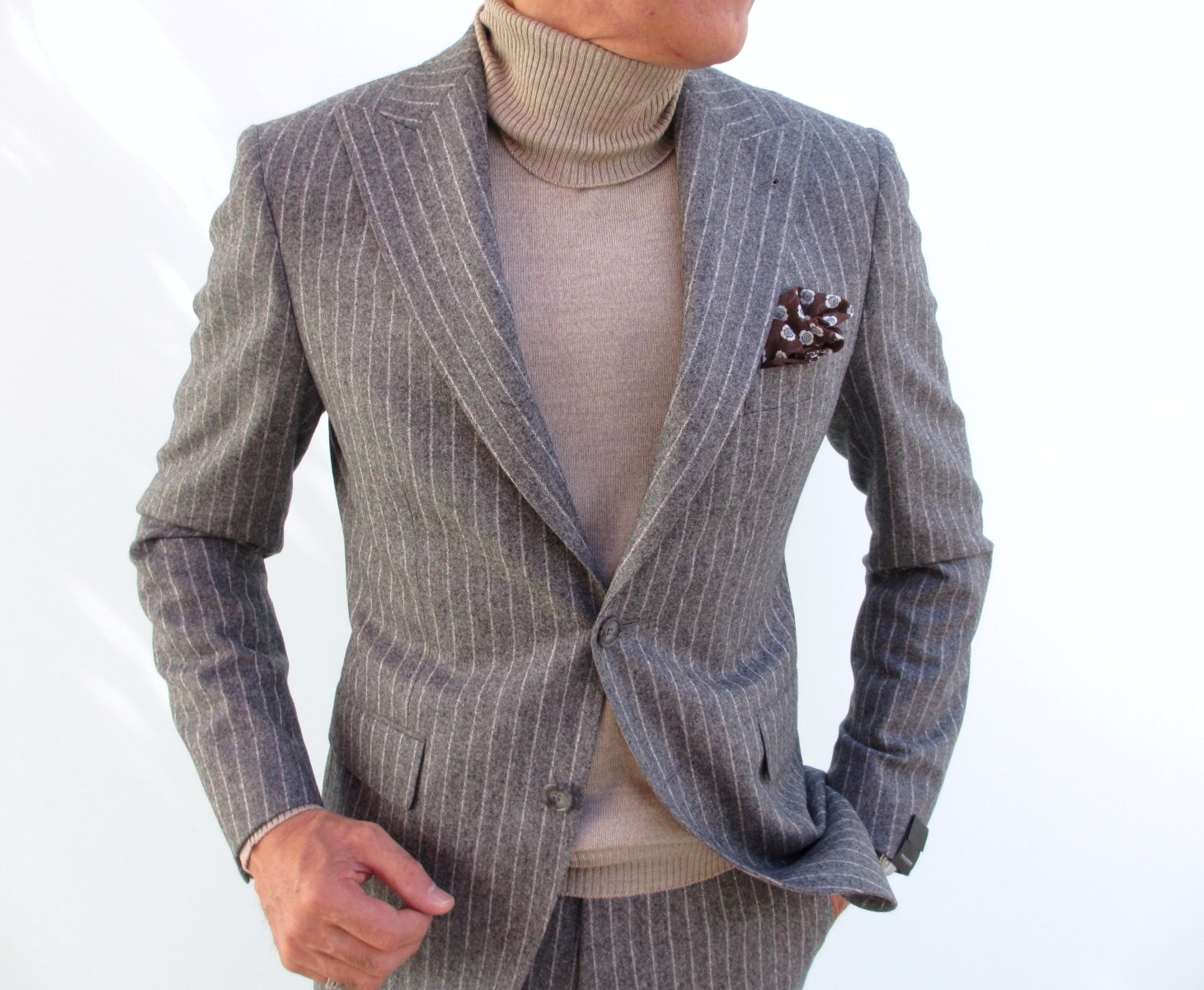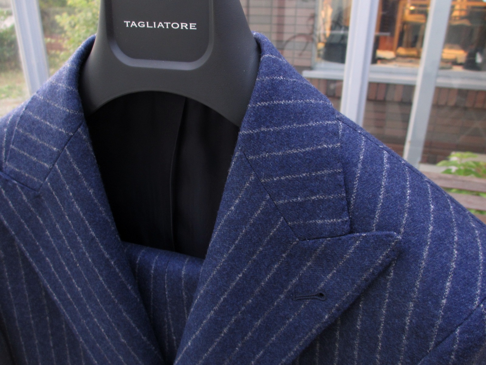 今季、ご紹介させていただいた【TAGLIATORE/タリアトーレ】のスーツは、全て肩に薄い芯地を入れたモデル「ベスビオ」。ただ、唯一、肩に薄いパットを入れ、構築的なフォルムを形成するモデル「ナポリ」でセレクトしたのが、こちら。ピークドラペルが、よりクラシックで、粋なスーツに見せています。