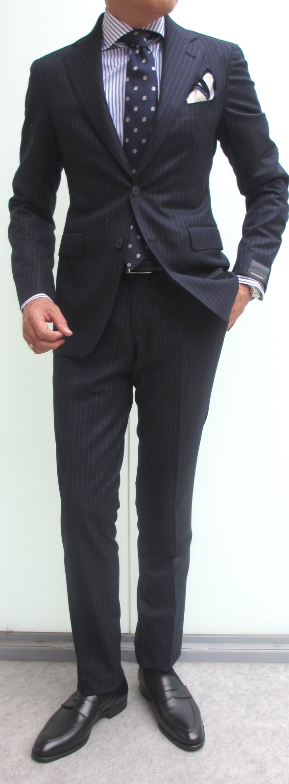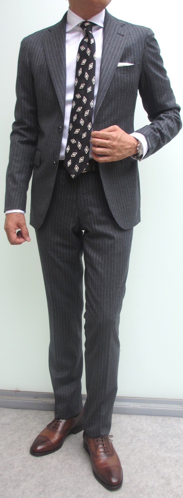 こちらも思いのほか早い夕暮れに、生地のアップ写真を撮り損ねてしまいました。決して厚手ではありませんが、サキソニーに比べると、やや質感のあるフランネル調のスーツ。ノータイで着崩したり、ジャケット単品でも使える便利さは、シチュエーションの幅が広く、遊びの入れやすいスーツです。