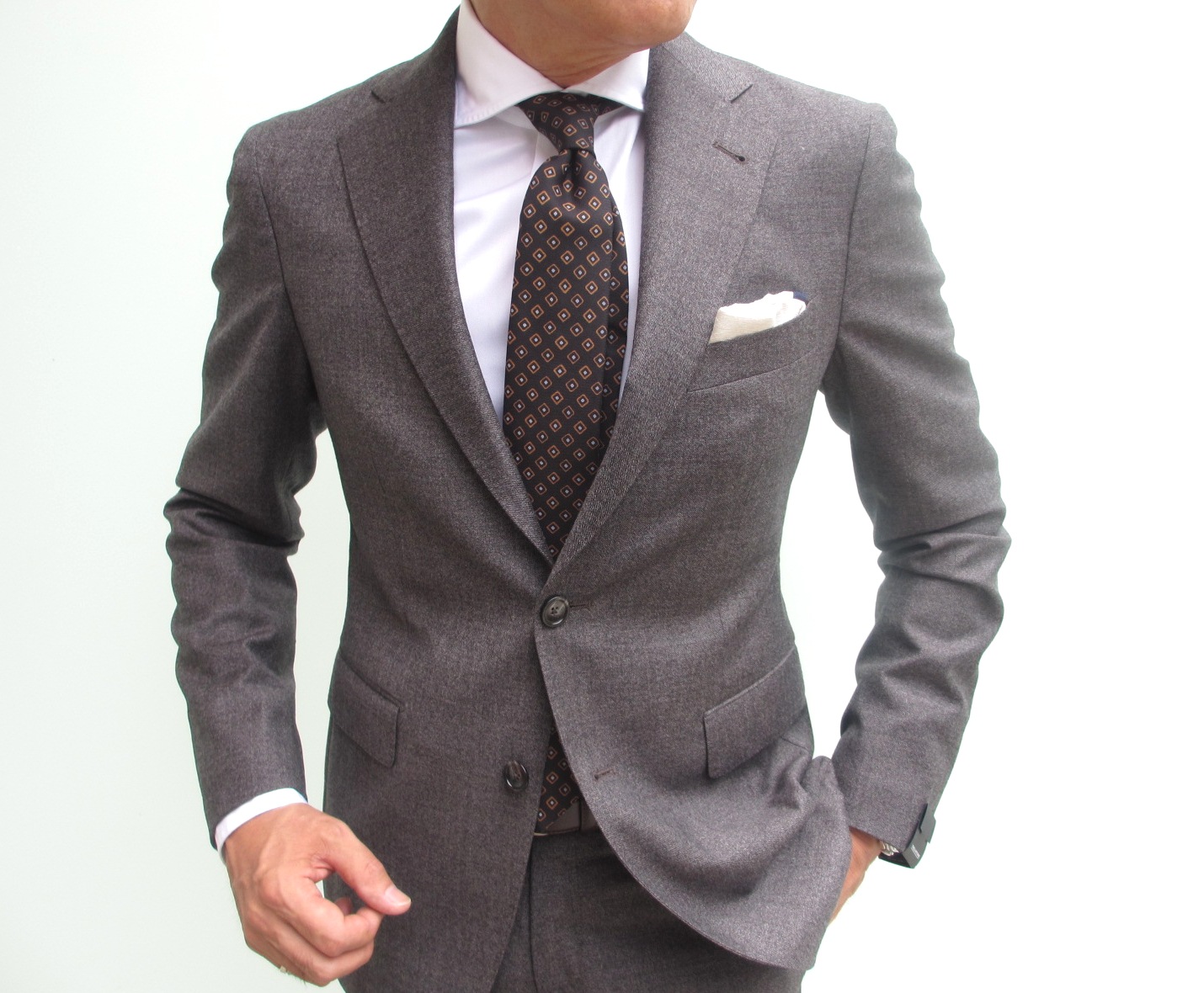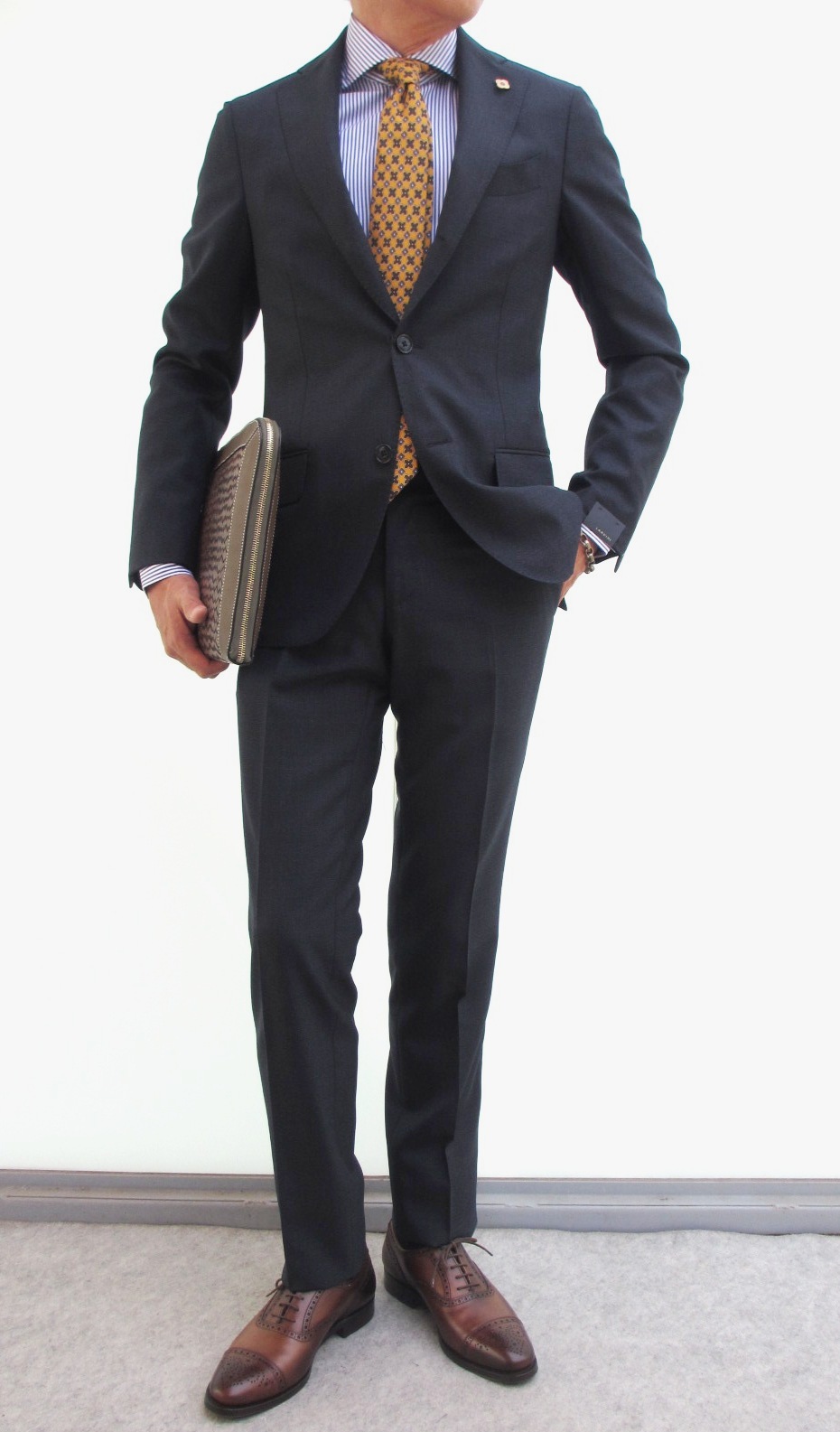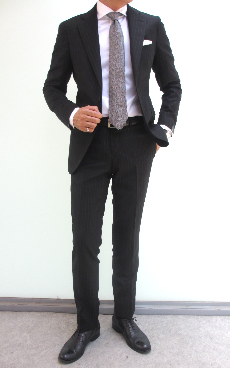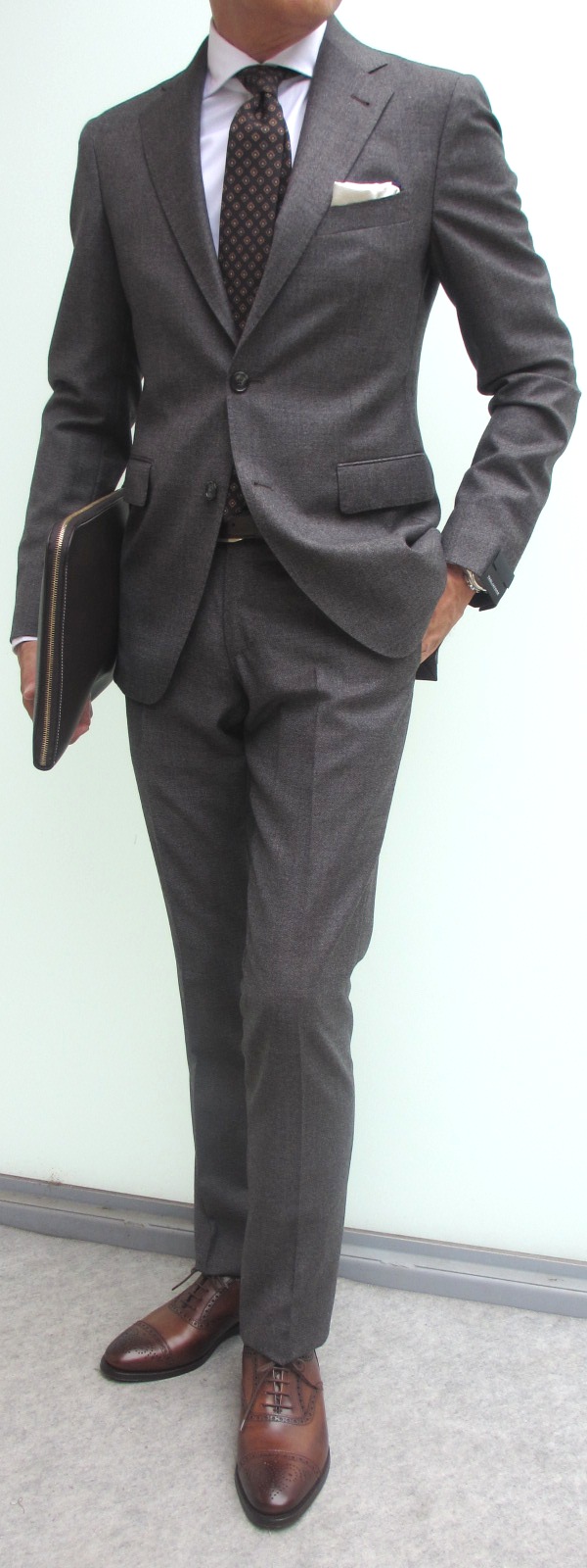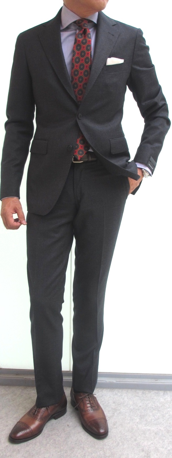 モデルは身長175㎝、体重63㎏、胸囲91㎝でサイズ44をややタイトに着ております。チャコールグレイ、ミディアムブラウン共にシャツはBARBA、ネクタイ、チーフはFRANCO BASSI、靴はCROCKETT&JONESです。