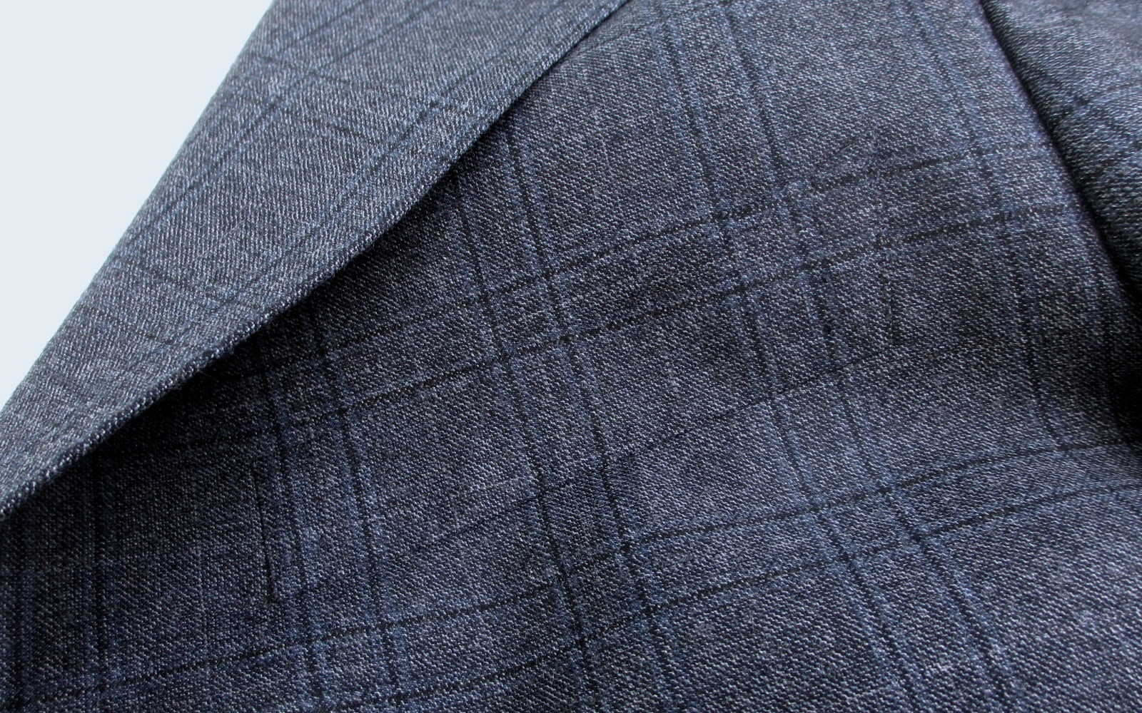 ネイビーとブルーの濃淡2色を織り合わせた杢ベースに同色を配したチェック柄。スーパー130'sのしなやかで上品なスーツに仕上がりました。