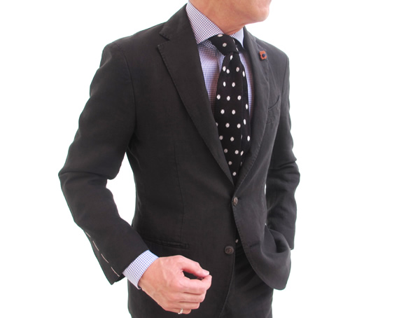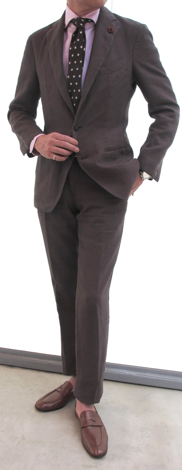 全てタイドアップしてみました。実は、着用のネクタイ、後でご紹介いたしますが、【LARDINI/ラルディーニ】のもの。ガーメントダイのリネンスーツは、ジャケットやパンツ単品として使えるのが魅力。ジレを既にお買い求めの方は、スリーピースとして(オーカーブラウンのみ、スーツの色が薄くなります)。この夏、控えめに目立ちたいなら、ぜひお勧めのスーツ。オン・オフと、広範囲に活躍するはずです。