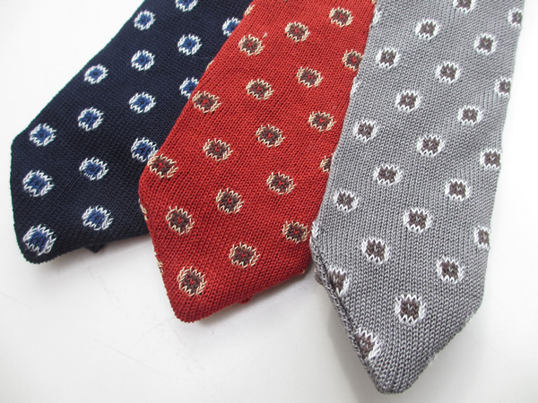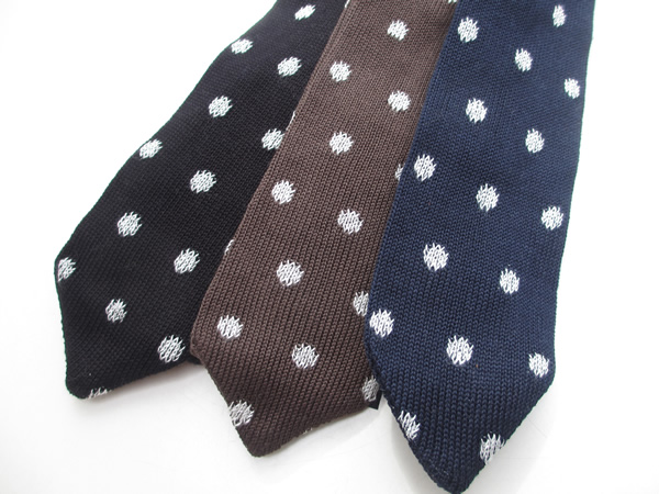【LARDINI/ラルディーニ】の展示会で見つけたコットンのニットタイ。ニットタイといえば、大体が大剣の剣先がとがっていませんが、こちらは普通のネクタイのように三角形に。そこがセレクトのポイントになりました。先に紹介させていただいたリネンのガーメントダイスーツに合わせるなら、「これだぁ~」と叫んだのは言うまでもありません。