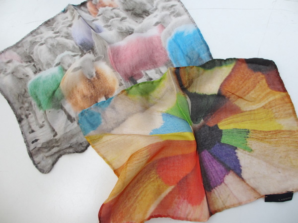 こちらのチーフの甘い誘惑に、ついついオーダーです。レーヨンのしなやかな透け感にメロメロ。羊さんと色えんぴつのモチーフが可愛すぎです!
