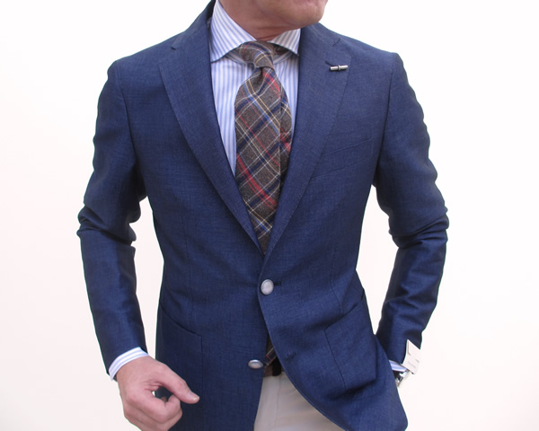 モデルは身長175cm、体重63K、胸囲91㎝でサイズ44をややタイトに着用しております。合わせたシャツはBARBA、ネクタイはFRANCO BASSI(未公開)、靴はDOUCAL'Sです。