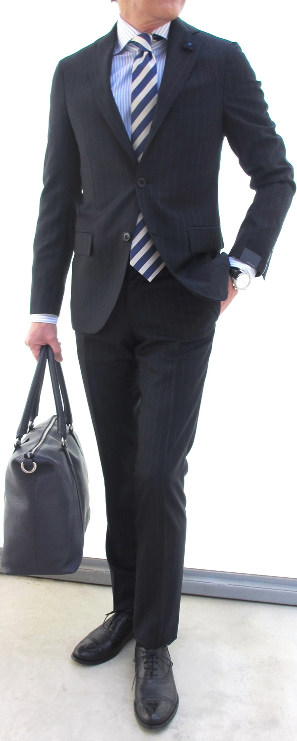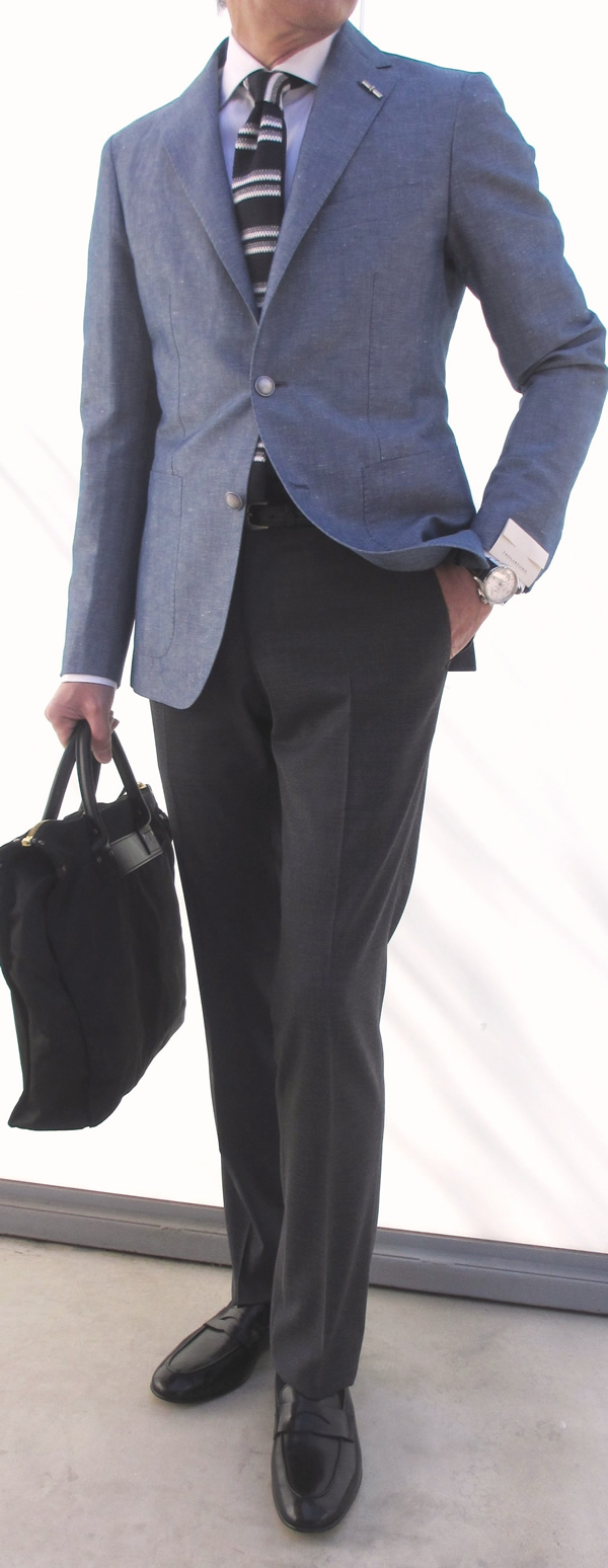 サイズの合うスーツは、ポージングも自然と決まります。特にウエストは楽ですね。ダークグレイとスレーキブルーの競演です。