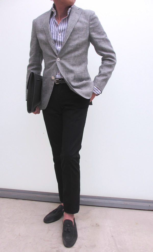 リネン・シルクのジャケットは、さりげなく上品です。モノトーンでまとめてみましたが、モード過ぎないのは良質な天然素材と【BOGLIOLI/ボリオリ】のエレガントなシルエットによるものでしょう。大人が着るにふさわしいジャケットです。