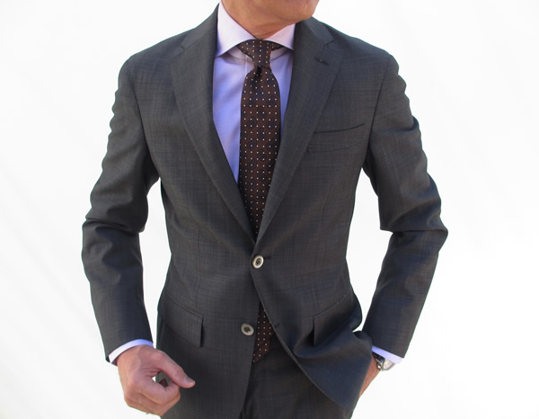 ダークなグレイですが、光の角度によっては、ややブラウンにも見えます。モダンなミニチェックで、こちらも「REDA」社の生地。ライラックのシャツとブラウンのタイで合わせてみました。