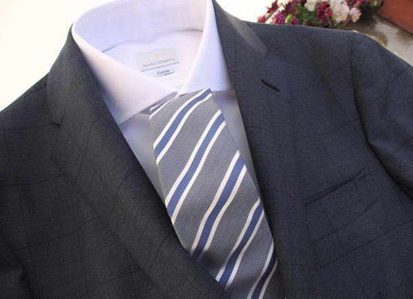 スモークがかったブルーにネイビーのウインドウペン柄。こちらも「REDA」社の生地。シックなブルーには、ホワイトのシャツに清涼感のあるストライプタイでコーディネートです。