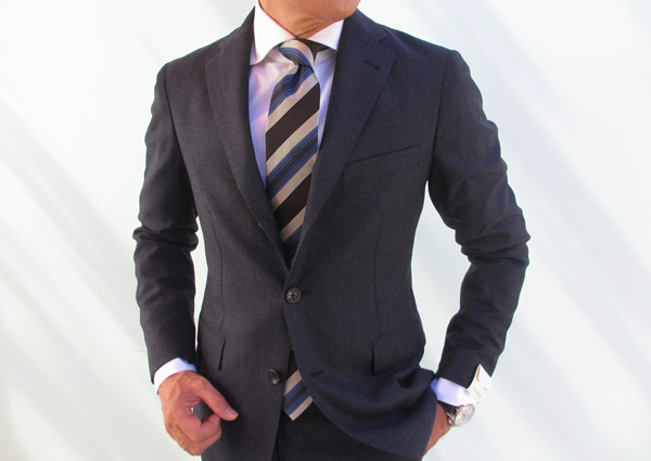 ダークブルーのバーズアイは、しなやかで上品な光沢を持つ知的スーツ。質感のあるソフトな生地ですので、敢えてシャープなストライプ柄のネクタイを合わせてみました。