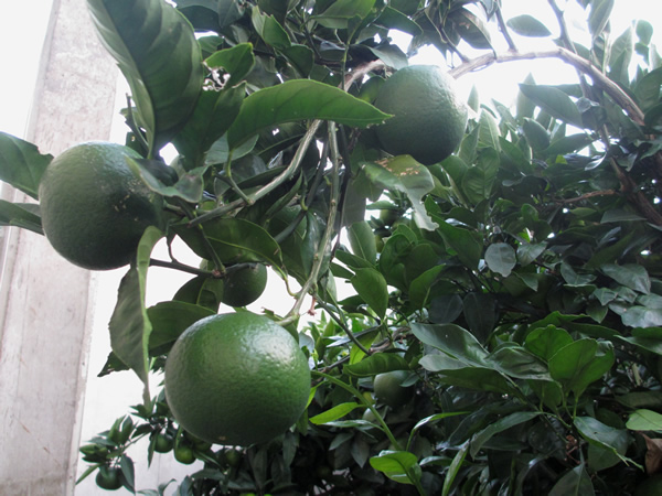 通りからは、殆んど見えませんが、店と大家さんの家は隣り合わせです。店の裏口から、ひょいと覗くと庭に植えてある蜜柑の果樹が目にとまります。今は緑色の若い果実ですが、秋が深まるとともに熟しながら橙黄色に変わります。自然の色は美しく、見ているだけで癒されます。トレードマークにしたい程のきれいなグリーンでしたが、3本の矢とオリーブの実を摑んだ白頭鷲が、既にありましたね。