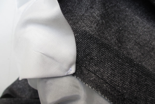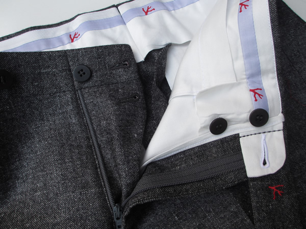 ジーンズ以外は、どのパンツも後ろにウエストを調整する予備の布が付いています。写真をみてお分かりになるかと思いますが、【ISAIA/イザイア】のパンツには、かなり多めにとってあります。さらに驚いたのが、通常、ウエストとヒップの上部しか出すことができませんが、シック(股間部分の補強)まで予備布があるため、ウエストから股間部分まで自然に出すことが出来ます。