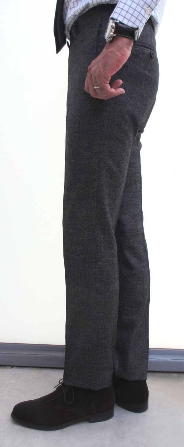 一番上の写真でいうと先頭のスーツです。逆光で色目が分かりにくいですが、シルエットはきれいに出ました。ウエストの高い位置からの絞込み、ウエストからヒップにかけての絶妙な広がりが、ボディコンシャスな美しい曲線を実現します。当然、長めに切れ込んだベント。後姿もセクシーです。