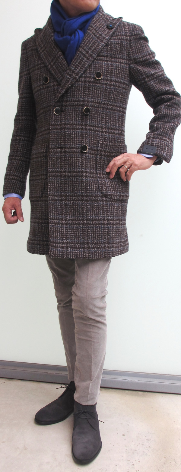 モデルは身長175㎝、体重63㎏、胸囲91㎝で44をややタイトに着用しております。合わせたシャツはBARBA(私物)、ネクタイはストライプがHolliday&Brown、シルバーのチェックがLeonardo Tazzari 、靴はDOUCAL'S、手に持ったコートはHERNO(未公開)です。