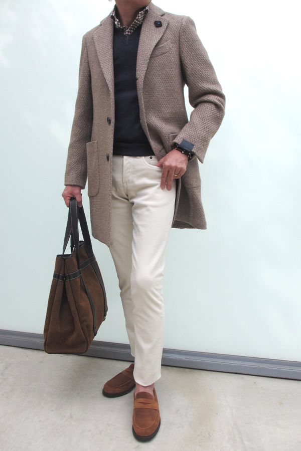 ジャケットのようなスポーティさとコートのエレガントさを併せ持ったスポルベリーノ。ジャケットとして着るのか、コートとして着るのかでサイズで悩むところですが、ここはタイトに44を着用してみました。