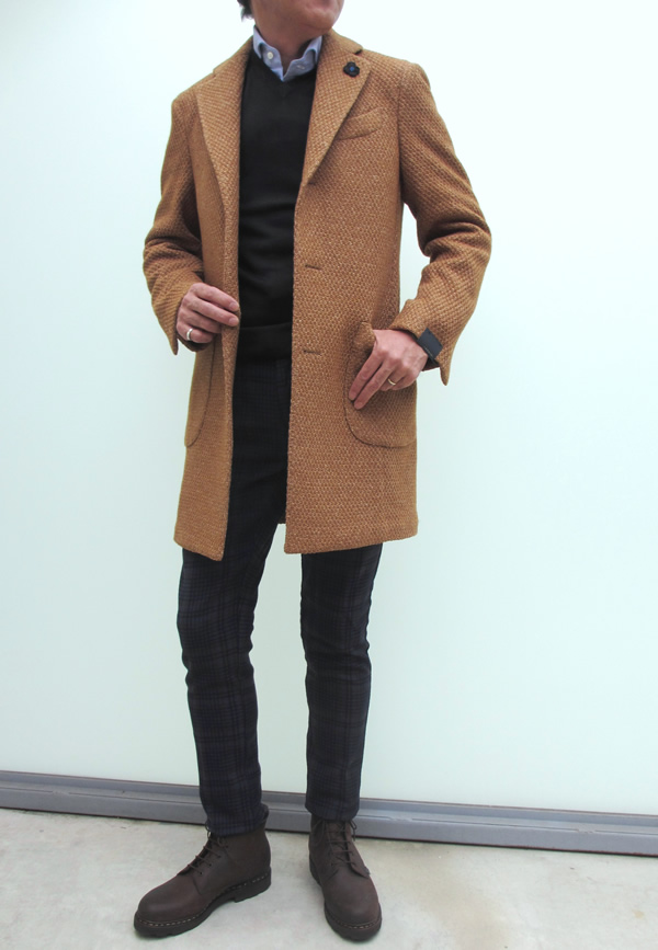 本日のトリは、アンゴラウールのシングルチェスターコート。高級感のあるエレガントな佇まいです。