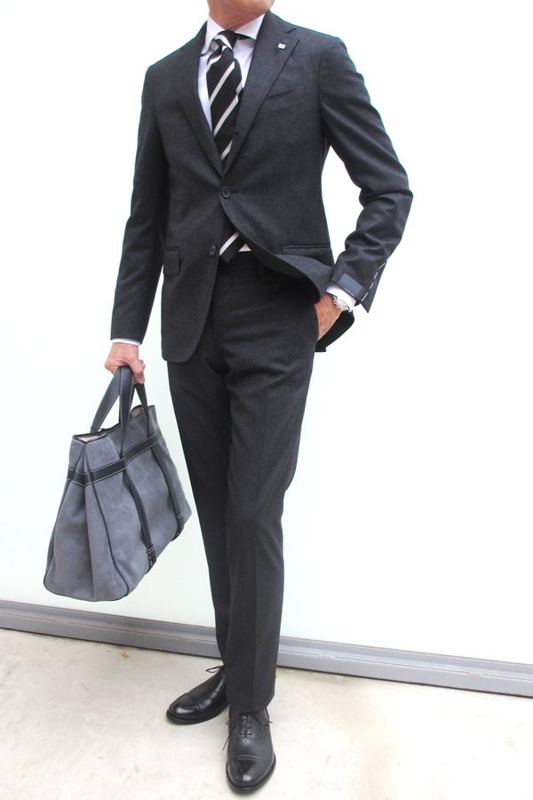 モデルは身長175㎝、体重63㎏、胸囲91㎝でサイズ44をややタイトに着用しております。合わせたシャツはBARBA、ネクタイはHolliday&Brown、手に持ったバッグはZANELLATO(未公開)、靴はDOUCAL'Sです。