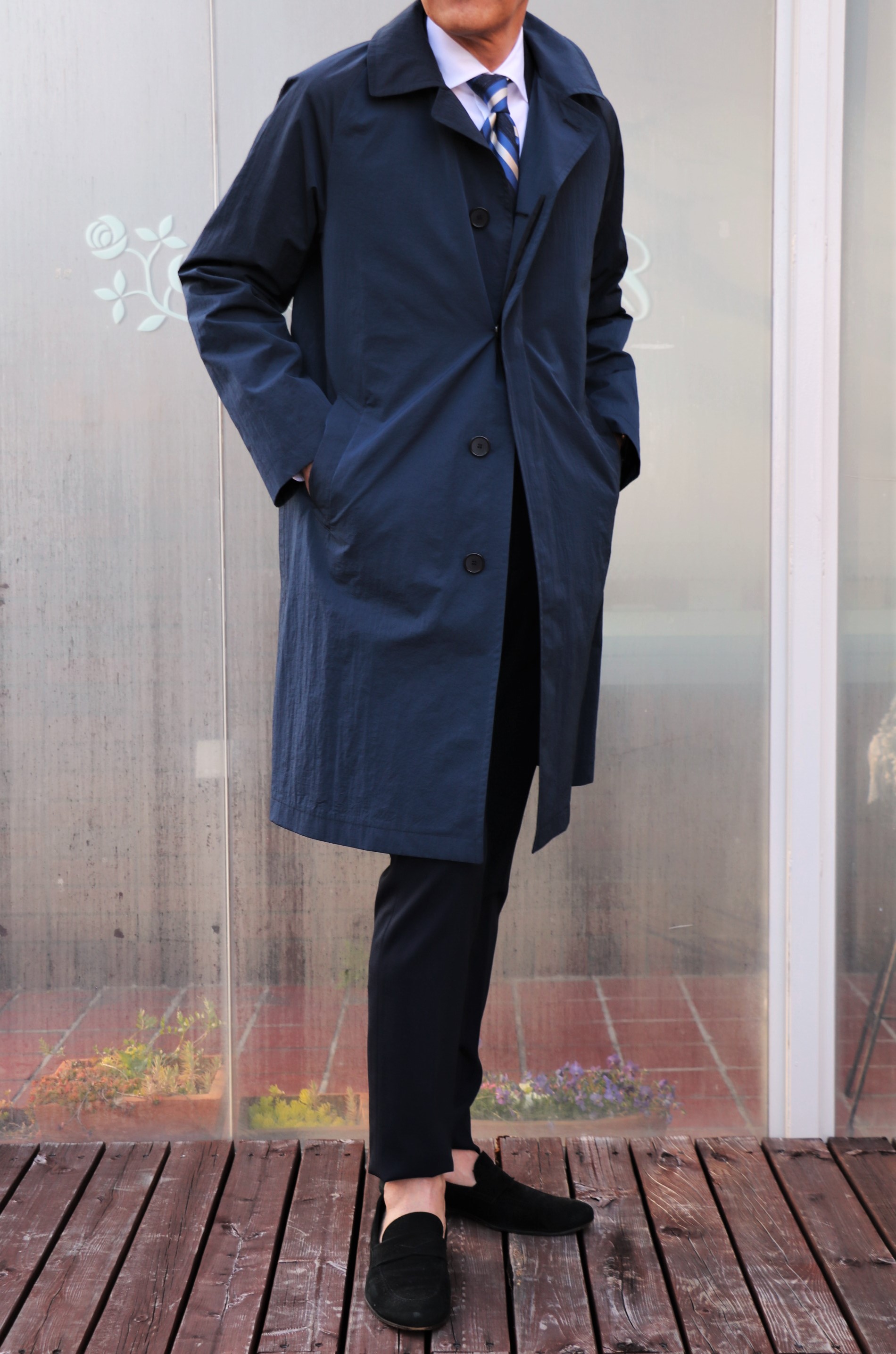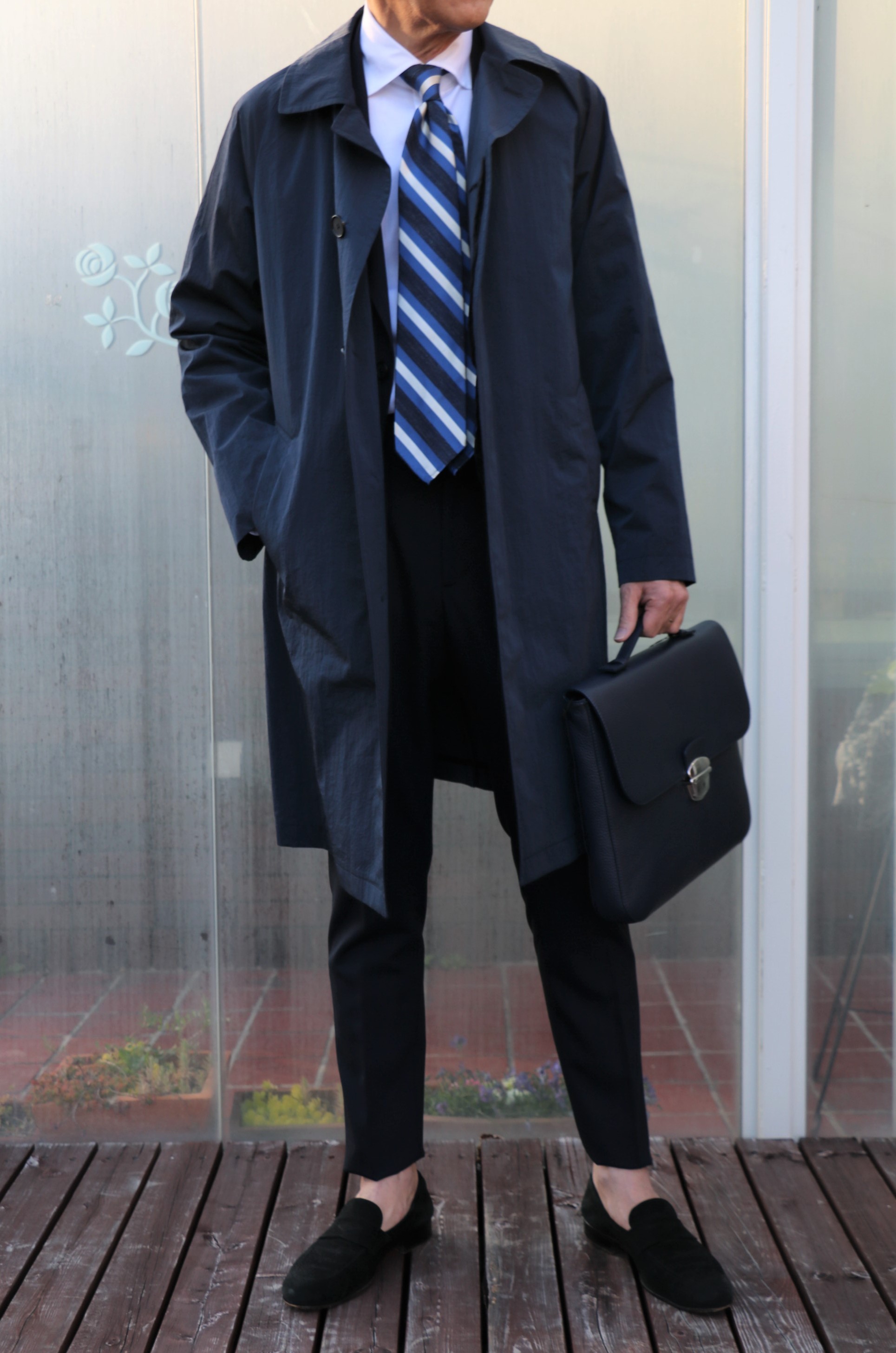 コーディネートのアイテムは、SUPERGA(スペルガ)のスニーカー以外、全て新作です。ブラックのスリッポンは私物。本当はBaudoin&Lange(ボードインアンドランジ)を使うつもりでしたが、レザーソールの為、私物で代用しております。