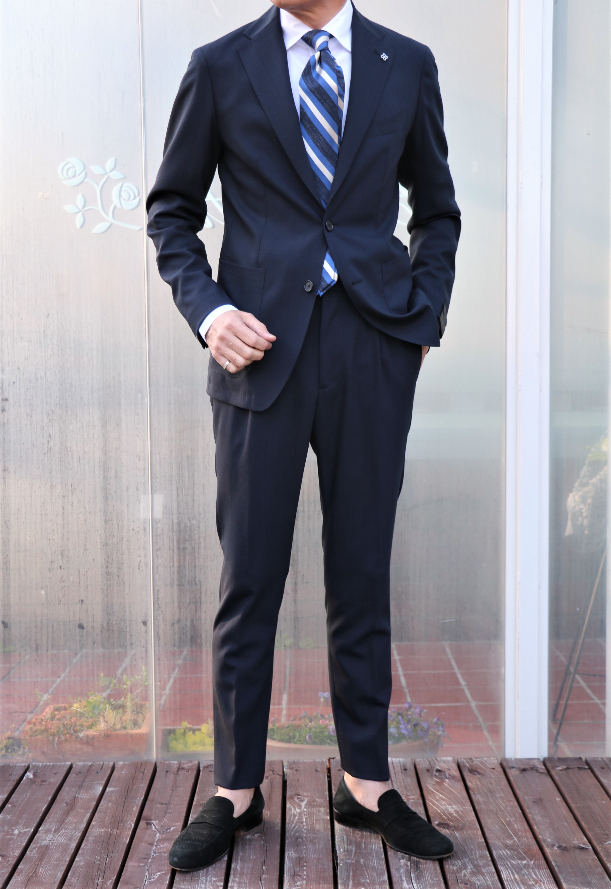同じスーツを使った2パターンのコーディネート。ご紹介するのは、ネイビー無地のスーツですが、ここまで遊びを取り入れることのできるスーツに時代を感じます。こんなスーツなら、真夏でも着たくなる、逆に着ていない方が暑いんじゃないかと思わせてくれる、そんな軽量、涼快な着心地です。