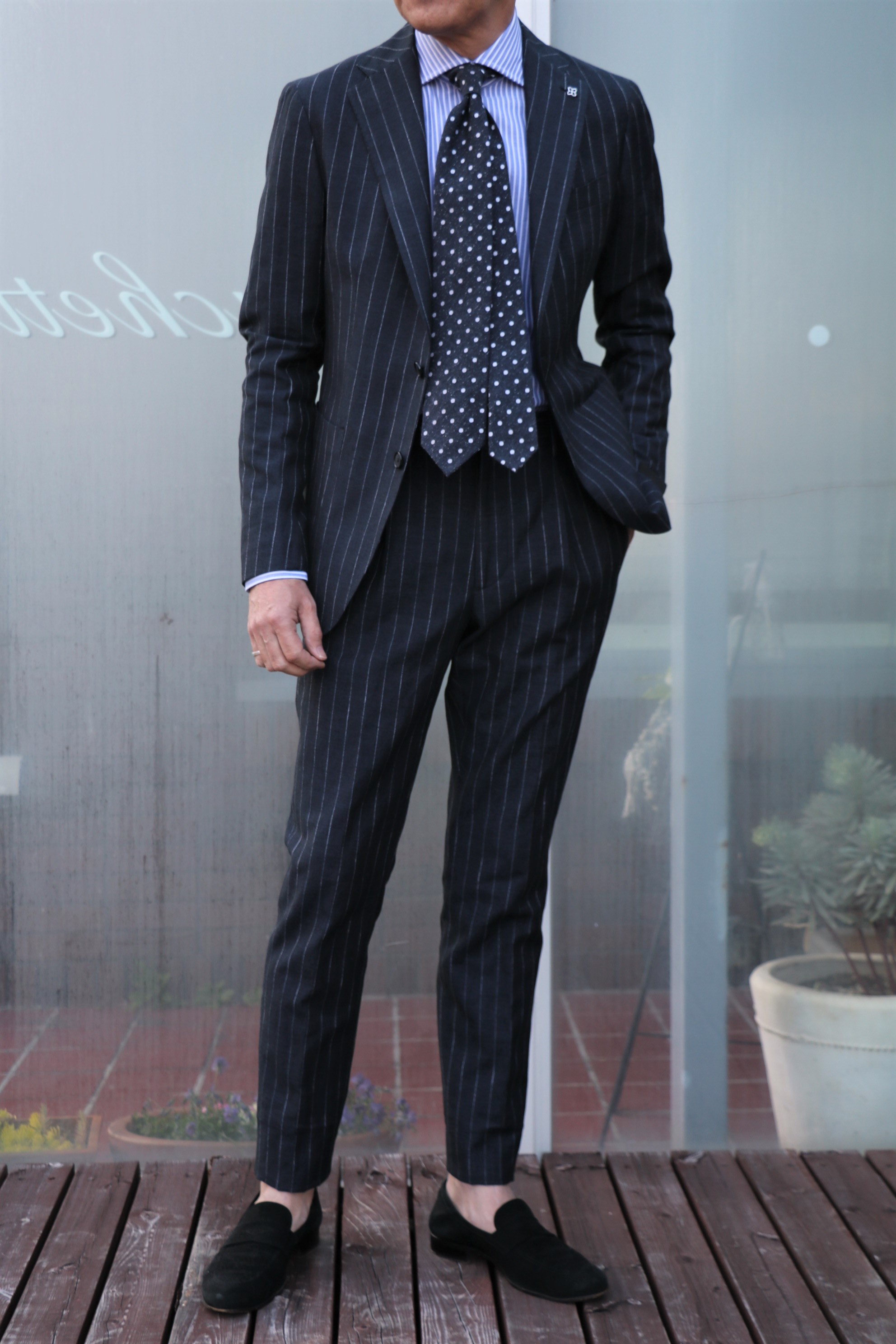 ネクタイ、シャツは直前のブログをご参照。パンツは未公開のPT TORINO、靴は私物のCROCKETT&JONESです。