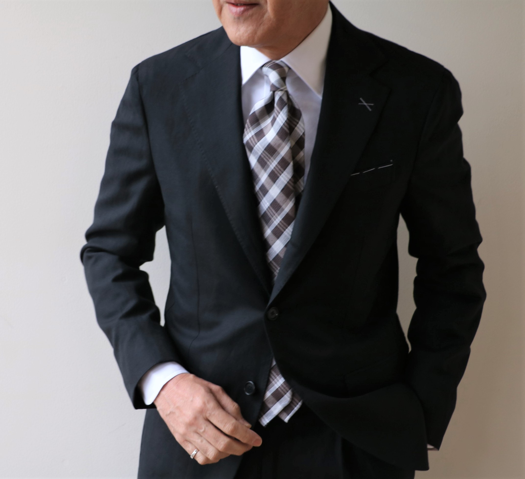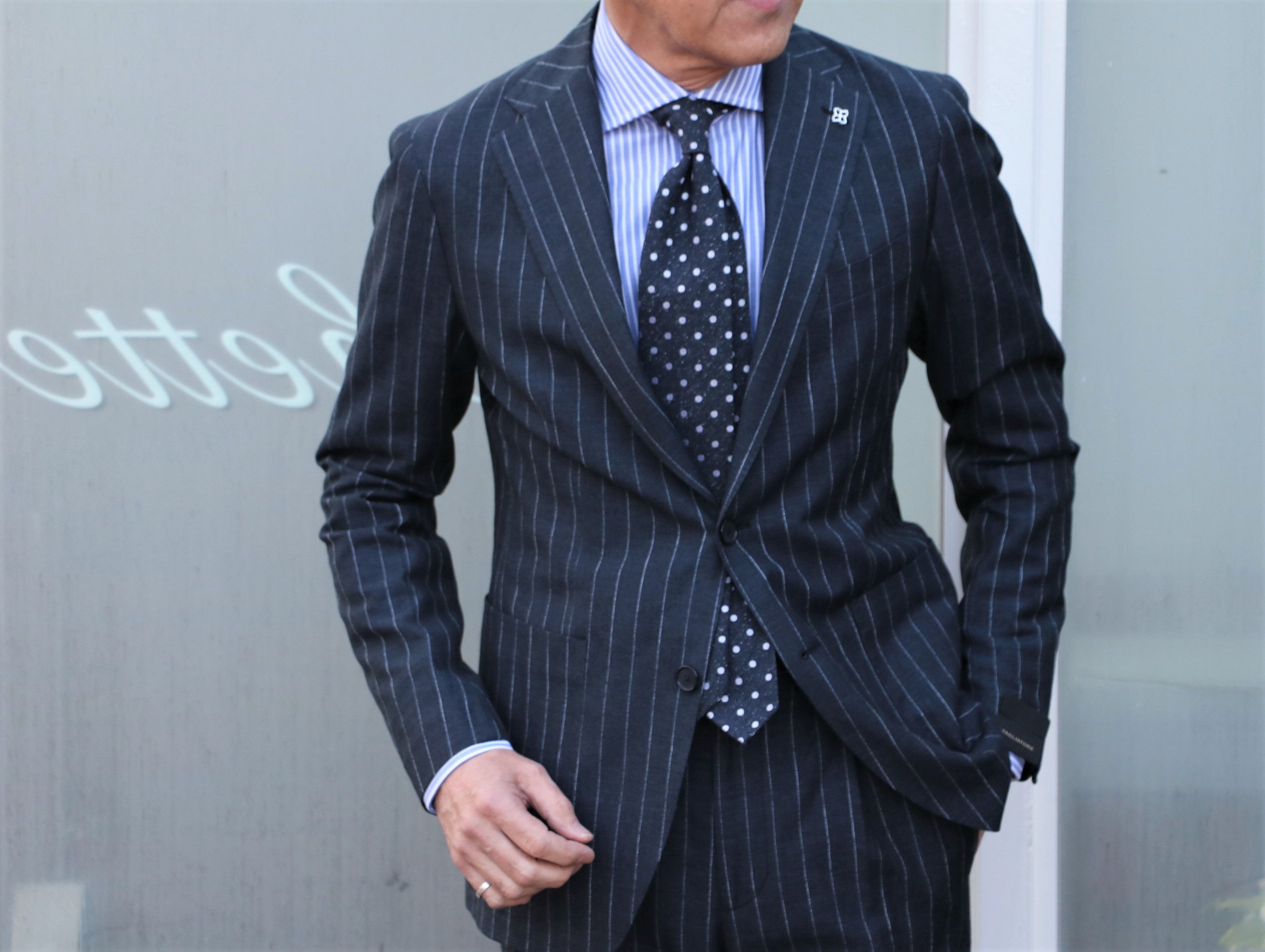 ブラックのフレスコタイでVゾーンを引き締めてみました。こちらも近日公開のF.Marino(フランチェスコ・マリーノ)です。