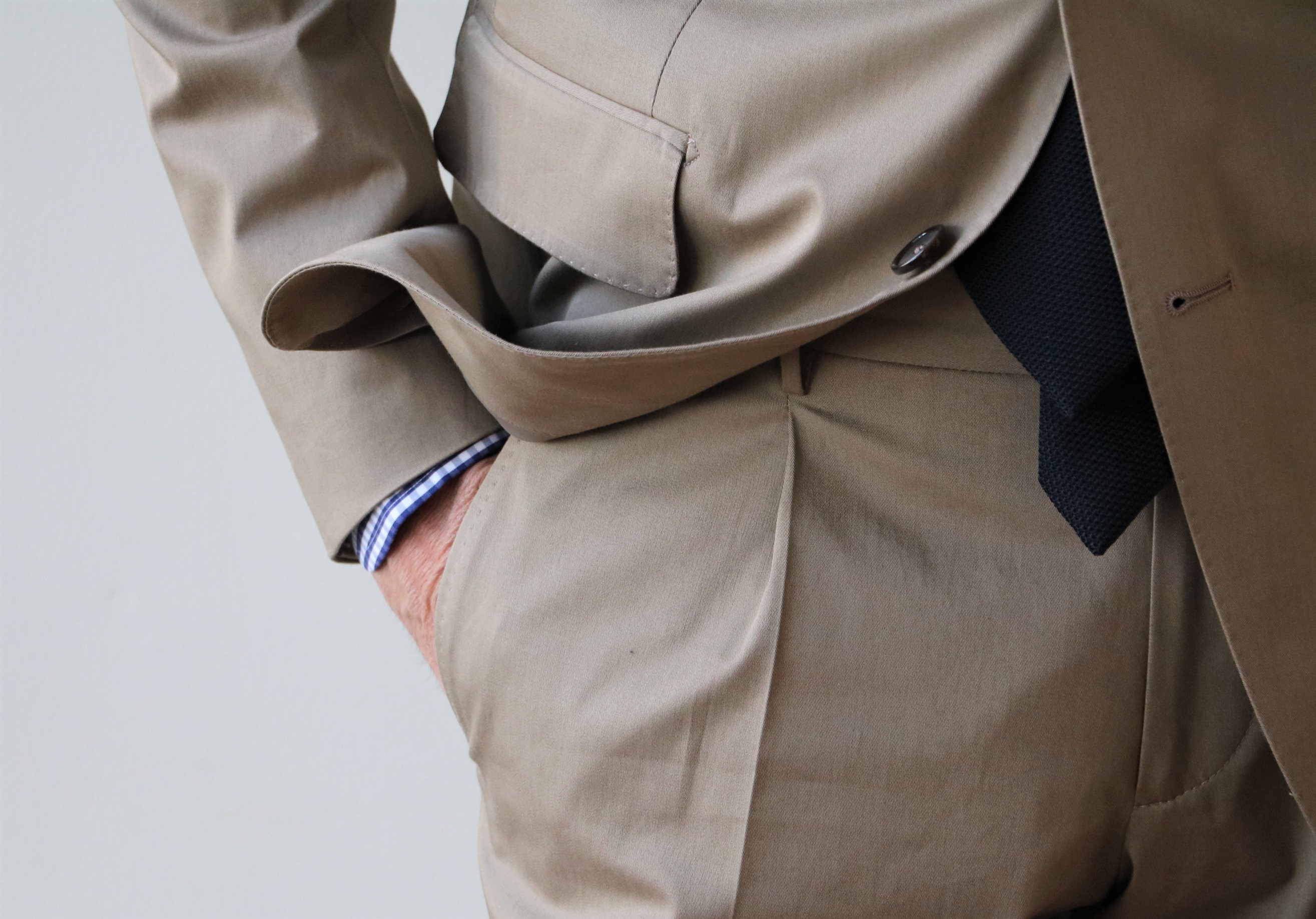春夏の必須アイテム、コットンストレッチスーツ。昨年はネイビーを。今季は、ベージュでのご提案です。