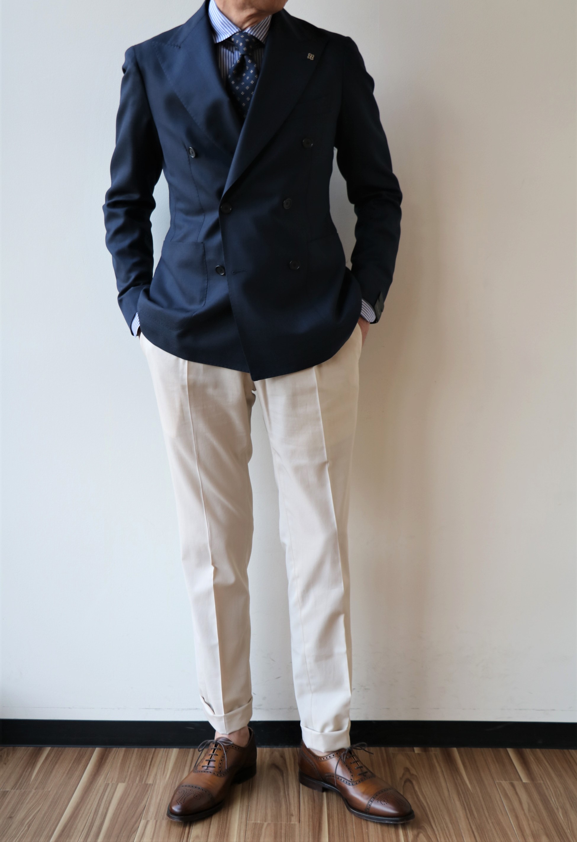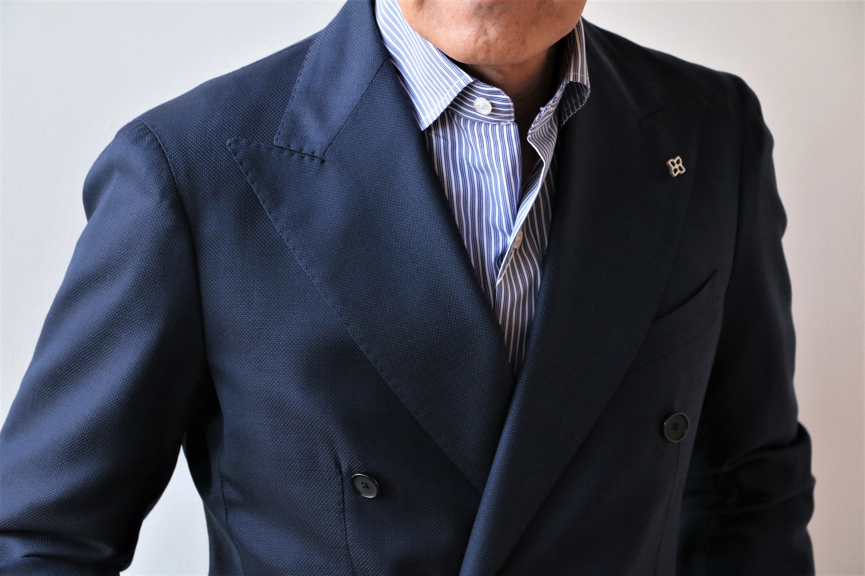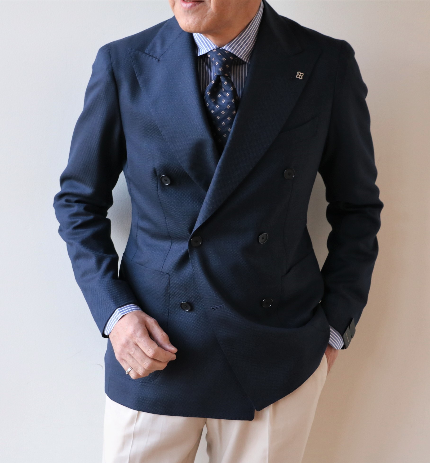 選んだ生地は、Super120'Sのウール100%。しなやかな質感と美しい光沢をもちます。やや明るめのネイビーが、リゾート気分をさらに盛り上げてくれるはず。ただ、現実的には、リゾートスタイルより、ホテルのバーやレストランなど、昼間の風景より夜の方が似合う場合もあります。サイズ46が売れない限り、様々なコーディネートでお見せするつもりの、そんな魅惑のネイビーダブルブレストジャケットです。