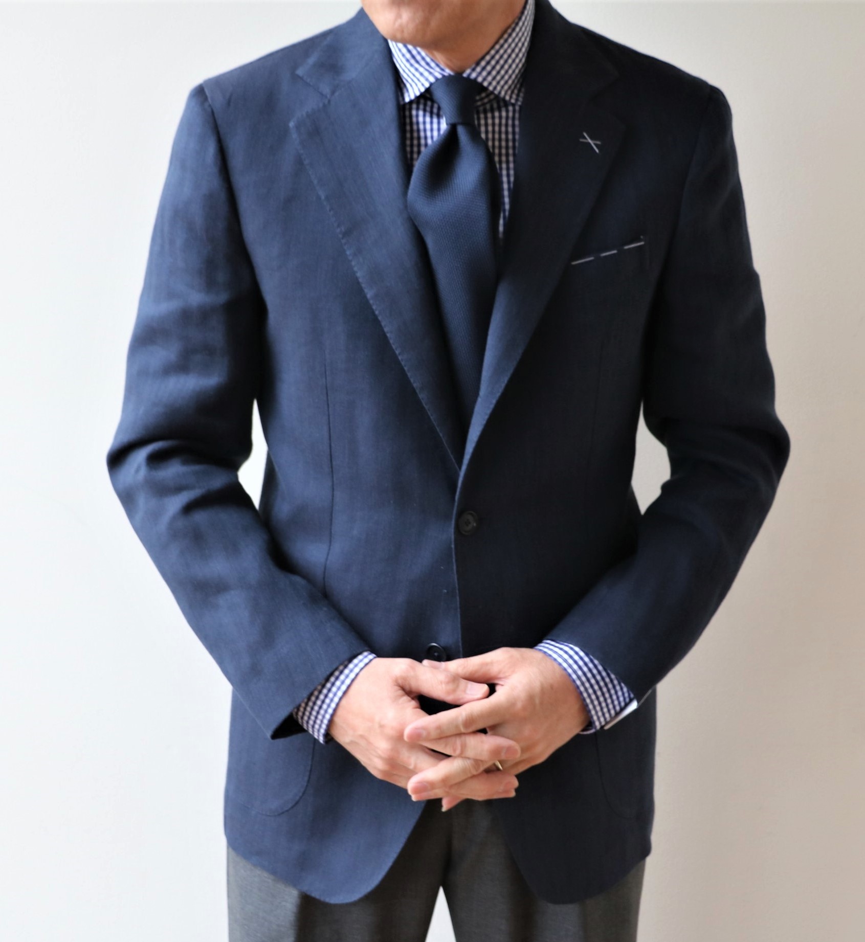今回は、セオリー通りにネイビーのギンガムチェック柄シャツ(Mario Muscariello)に、同色のソリッドタイ(未公開のF.Marino)を合わせ、ミディアムグレイのウールパンツ(未公開のZanella)を穿いております。