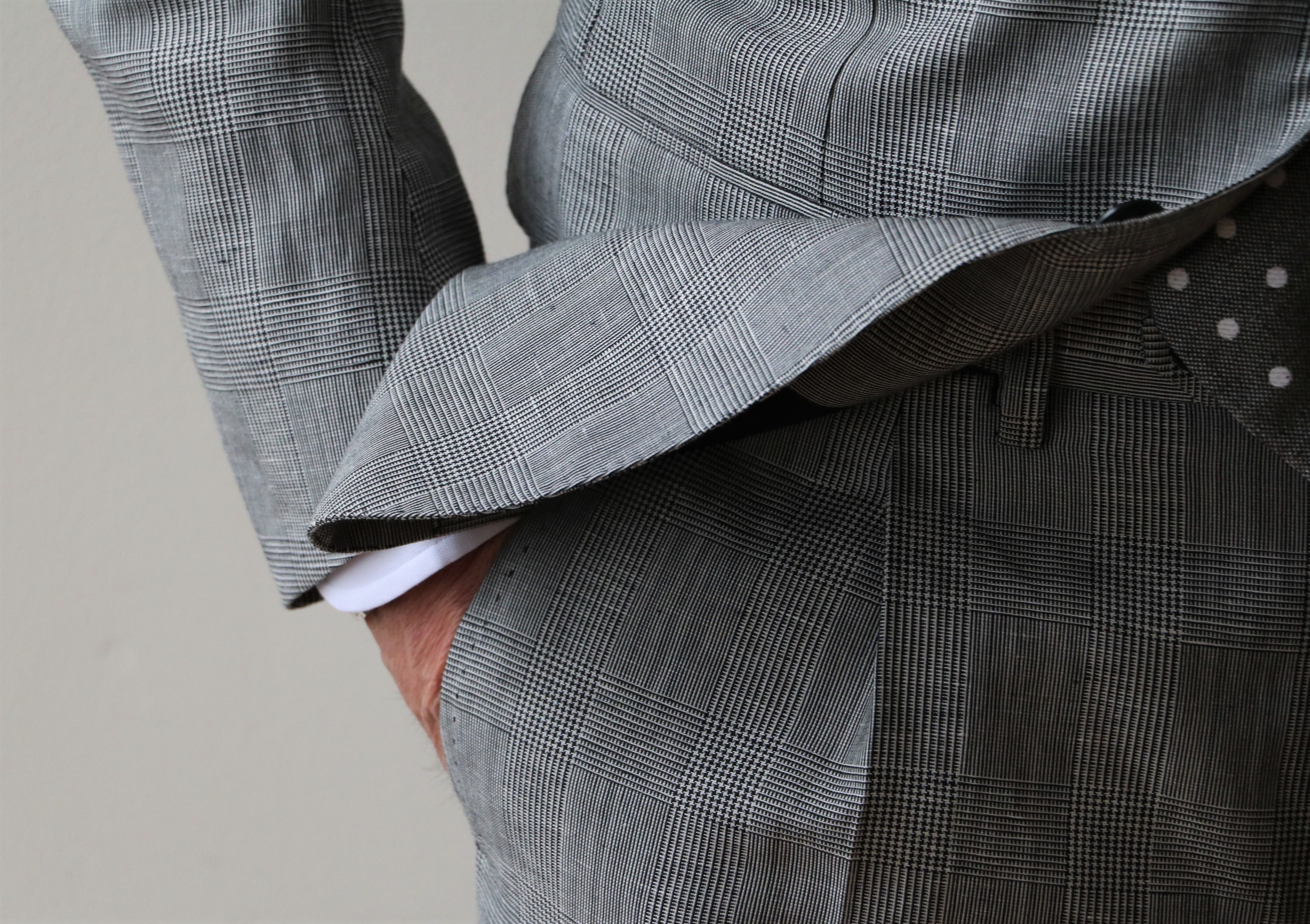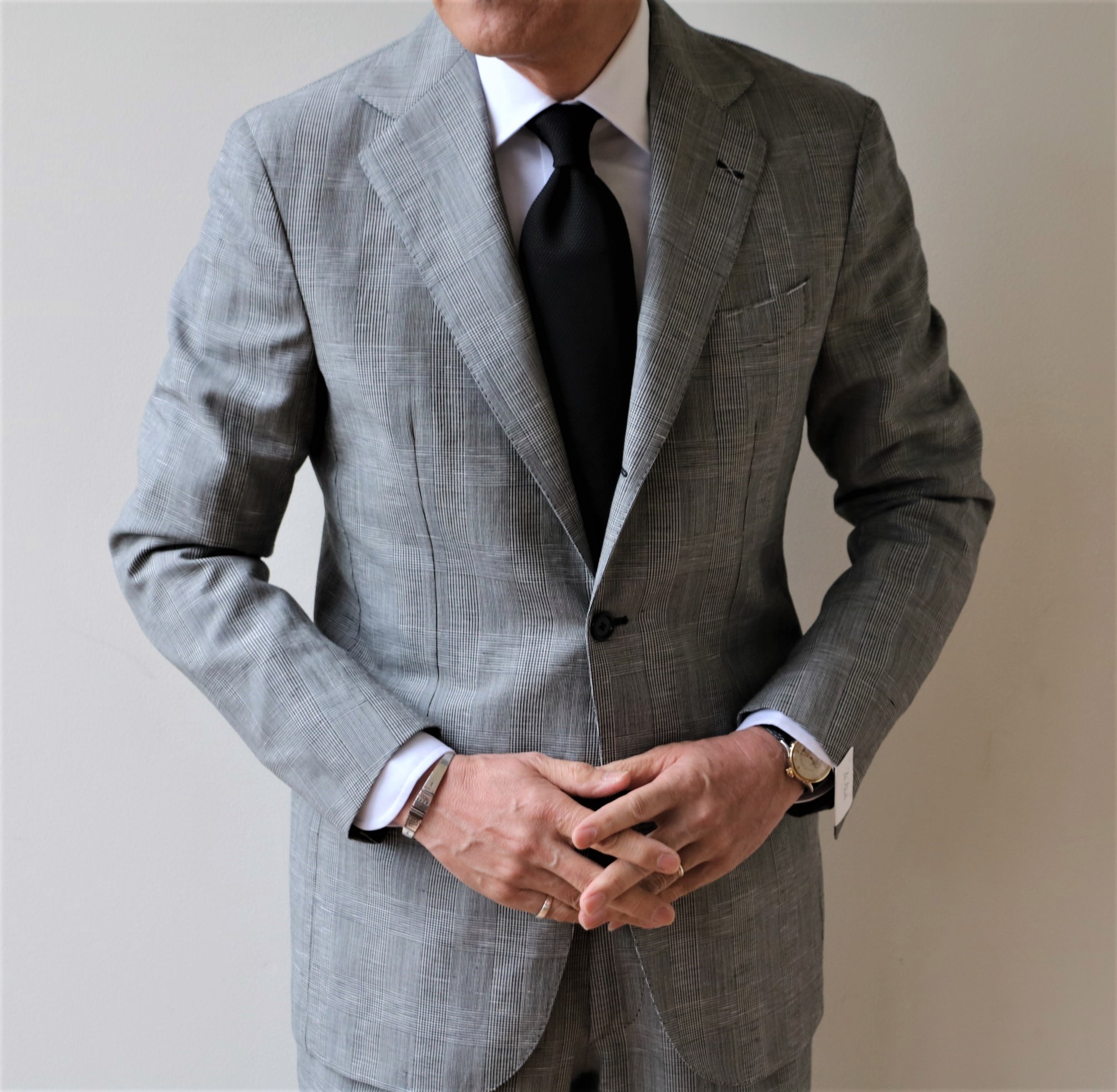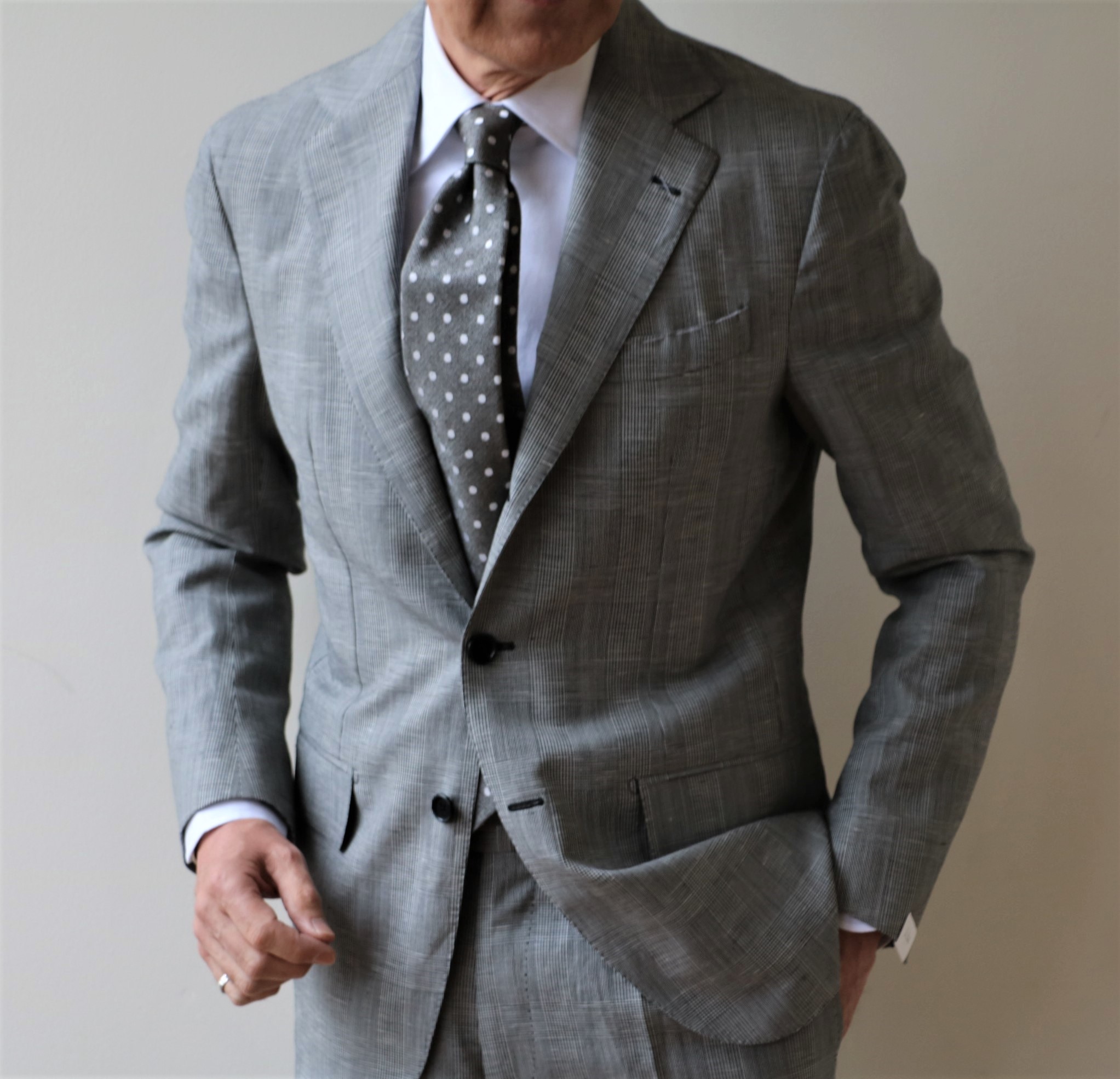 ウィンザー公がこよなく愛していたことから、プリンス・オブ・ウェールズ・チェックともいうクラシック柄のグレンチェック。リネン混で清涼感溢れる表情です。タイを締めましたが、ノータイスタイルも作りやすいスーツです。