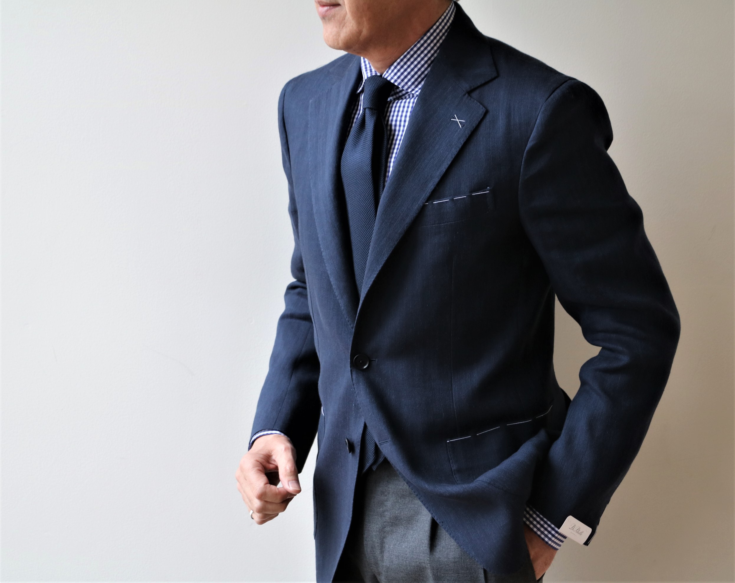 先にご案内のスーツ2型は、ハーフキャンバス仕立て「NAPOLI」。その肩の仕立てを軽くした3つ釦、2パッチポケット仕様の「Posillipo」でセレクトしたのは、大麻・ウール・モヘアのヘリンボーン柄ジャケットです。弾力性のある生地は、着込むほどに馴染んでいきます。