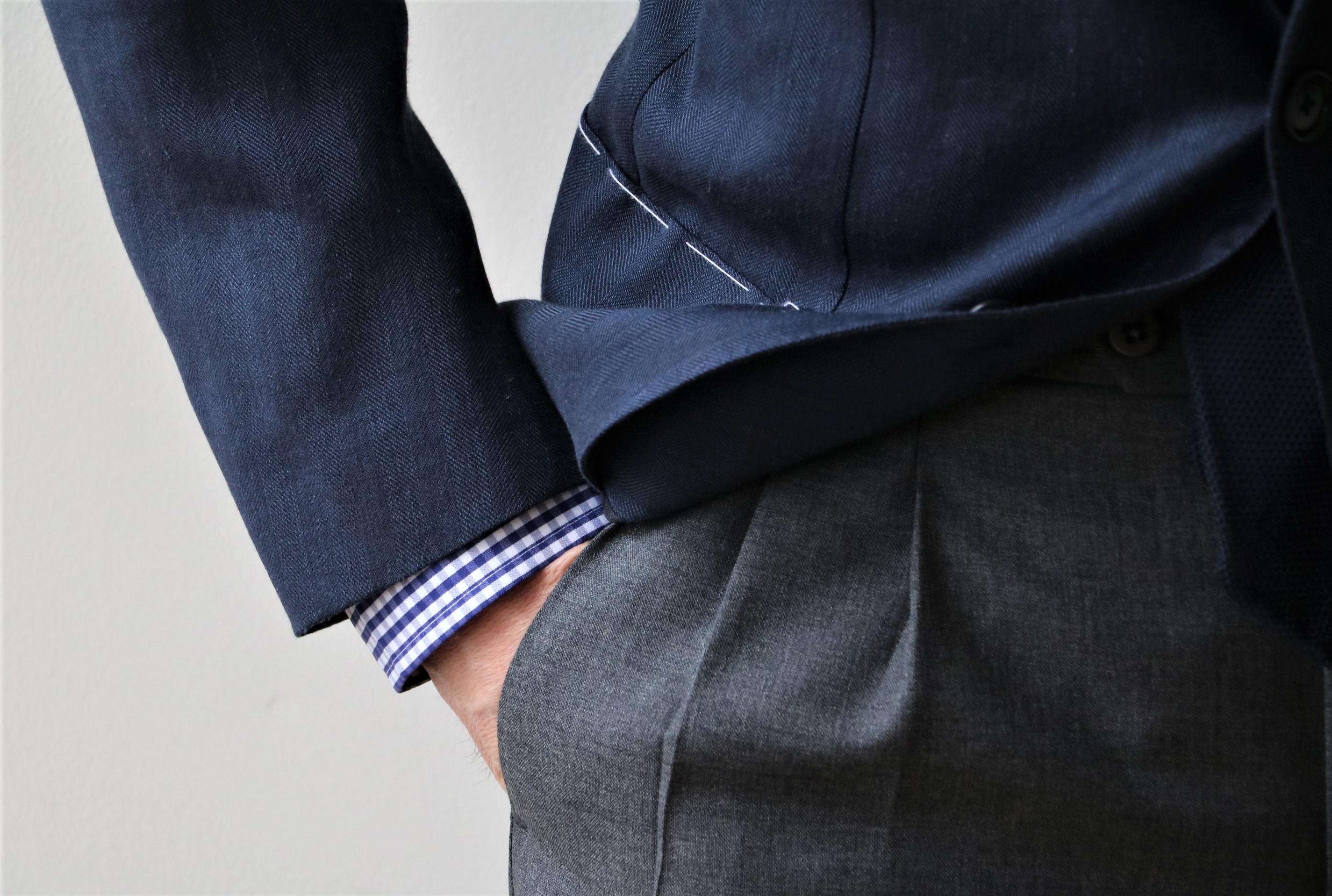 ナポリらしいギャザーの入った、柔らかな肩ライン。ラペル幅はやや狭めにしてあります。カマ(脇の下)を上げることで、アームホールもスッキリ。上げた分、袖を前振りにすることで運動量を確保できます。前肩縫製による首裏(うなじ)に吸い付くような着心地は、服を軽くするとともに正面から見た際、シャツにぴったり寄り添い、美しい襟元を見せます。襟元が開く上着は体に合っていない証拠ですので試着の際に確認してください。ここまでの着心地を実現するのは、かなりの修正が行われています。なぜかといえば、イタリア人と日本人の体形の違いがあるからです。
